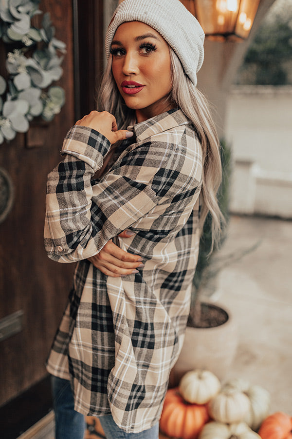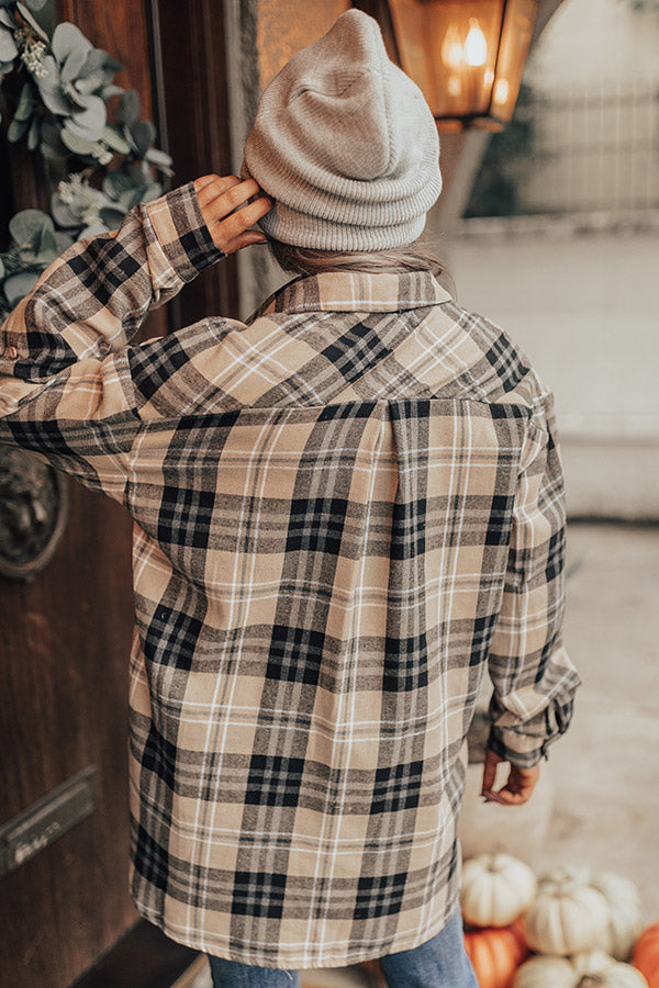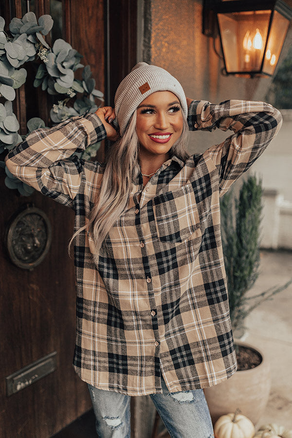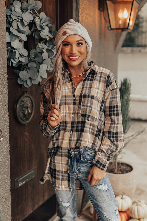 You will feel so cuddly when you wear this adorable warm taupe hued flannel featuring lightweight material patterned with a black plaid print, a button down front with a collared neckline, long loose sleeves with button closure cuffs, a single accent chest pocket, and a relaxed silhouette that falls into a rounded hemline! Measurements