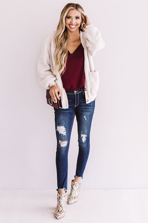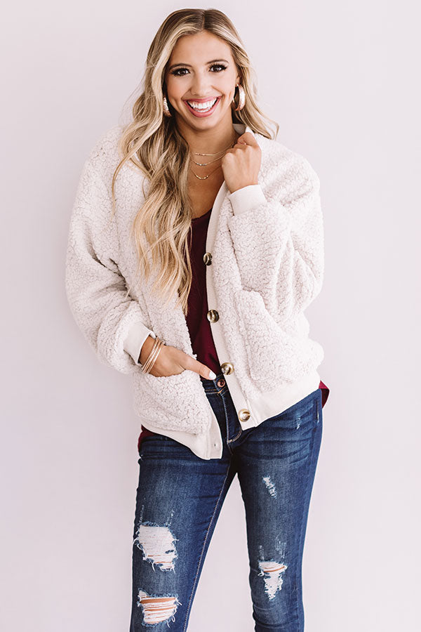 Your fall OOTD will look "so dashing" when you style it with this neutral sherpa cardigan featuring long billowing sleeves with wide fitted cuffs, two large pockets, a button up front with a bomber bodice, and a ribbed hemline! We have paired this ultra soft piece over a basic tee with some distressed skinnies, snake print booties, and a maroon crossbody, but you can also wear it with some over the knee boots and a beanie for a look that is sure to keep you warm AND fashionable this fall! Measurements