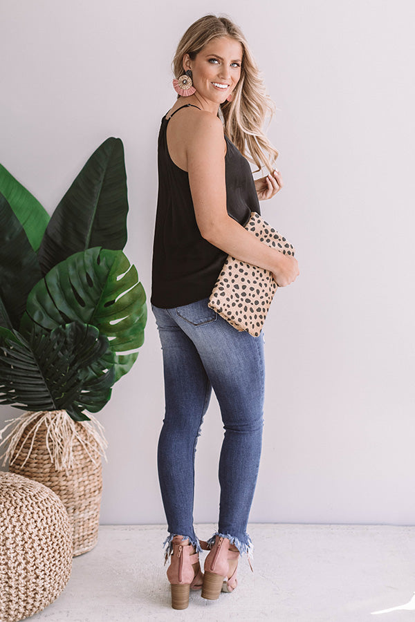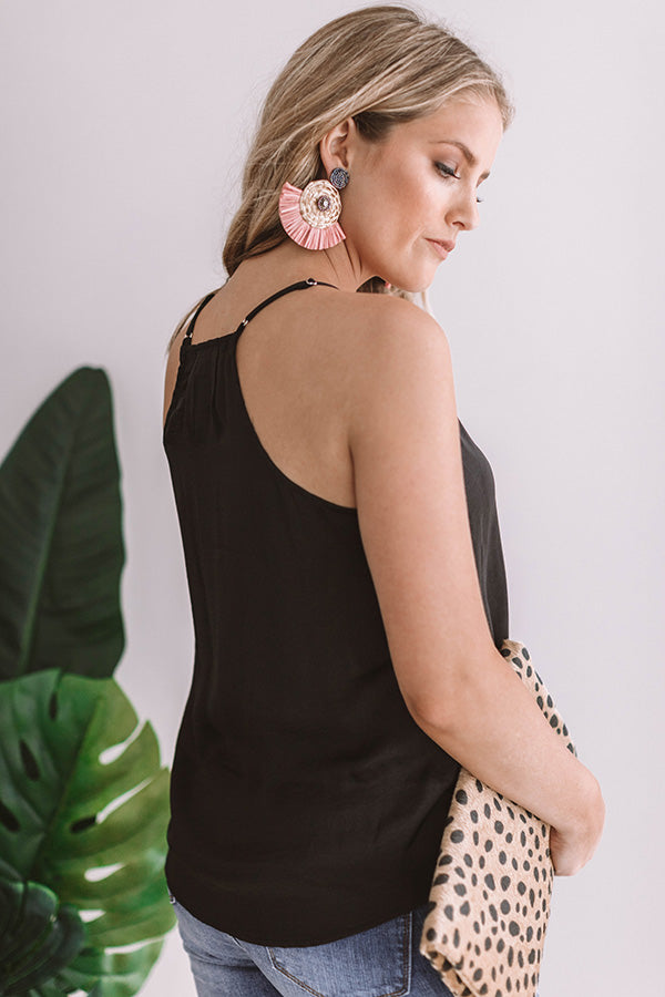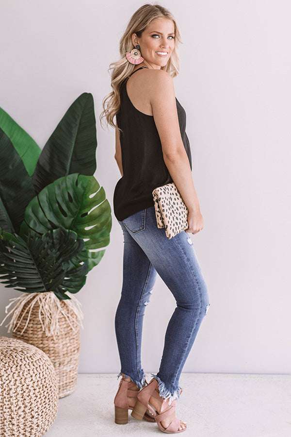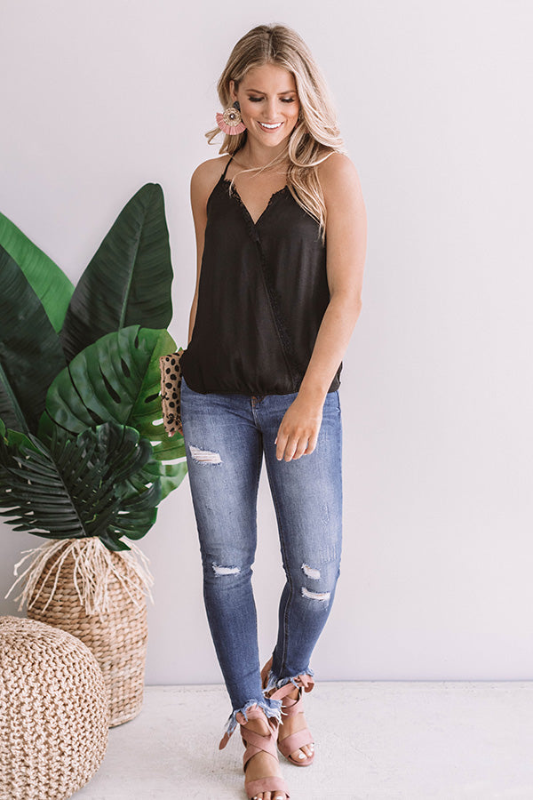 Light weight and breezy, this satin tank features a lace lined surplice neckline with hidden button closure, adjustable spaghetti straps and a banded front hem!