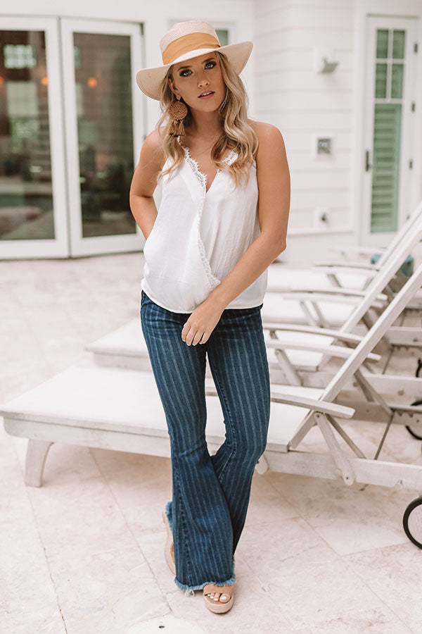Light weight and breezy, this satin tank features a lace lined surplice neckline with hidden button closure, adjustable spaghetti straps and a banded front hem!