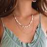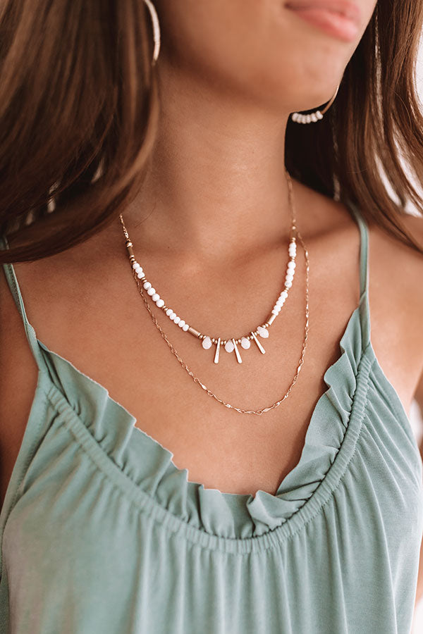 This necklace will have your neck looking so graceful with its long golden chain layered with a shorter white beaded one featuring gold and crystal charms!