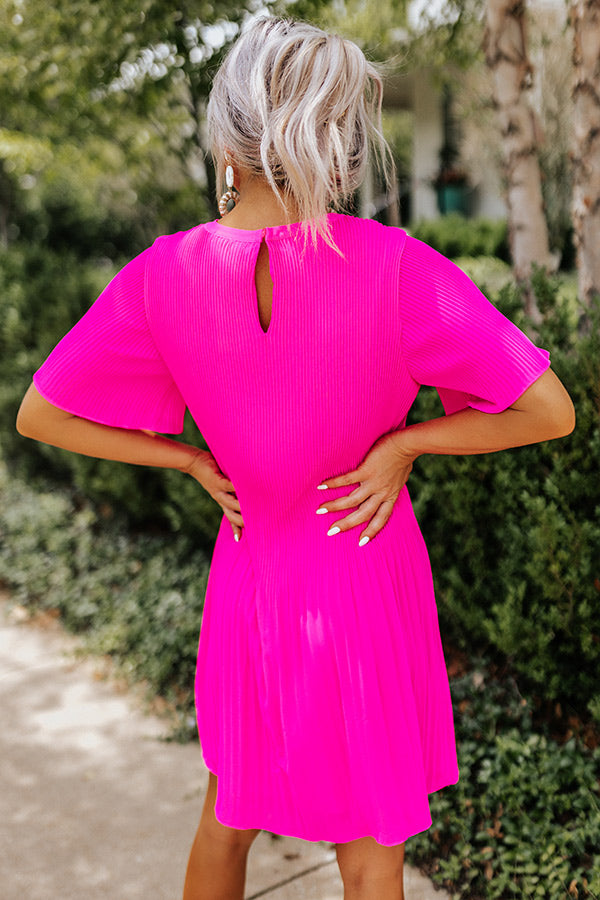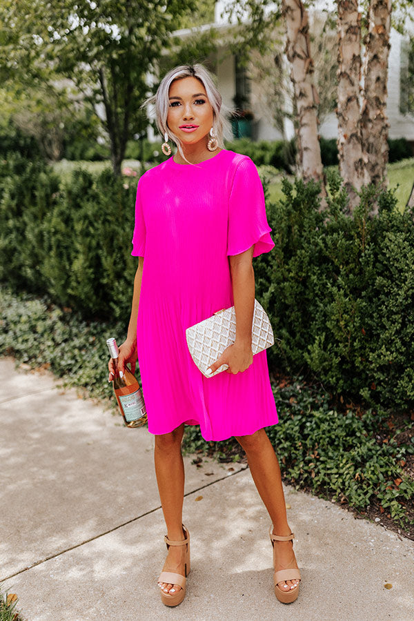 Spread some color with our adorable hot pink 'So Joyous' shift dress featuring lightweight breezy material with pleated texturing, a rounded neckline, short flowy sleeves, a keyhole accented upper back with a button closure, and a relaxed silhouette that falls into an uneven mid-thigh length hemline! Measurements