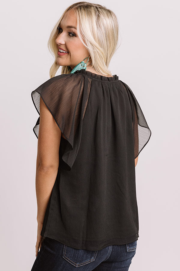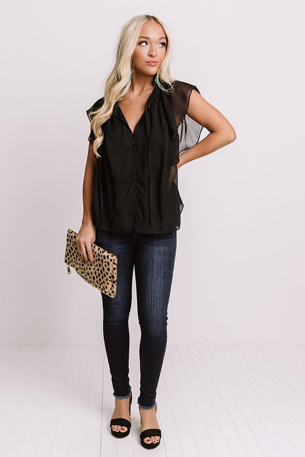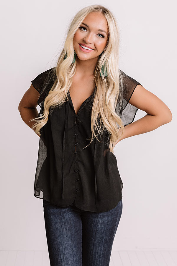 Dream up the perfect OOTD with our charming black "So Polite Top" featuring ultra lightweight semi-sheer material with a sewn in layer underneath, a button down front with a wide tie closure v-cut neckline, short draped sleeves, and a relaxed silhouette that falls into a rounded hemline!