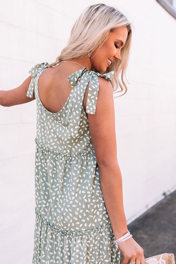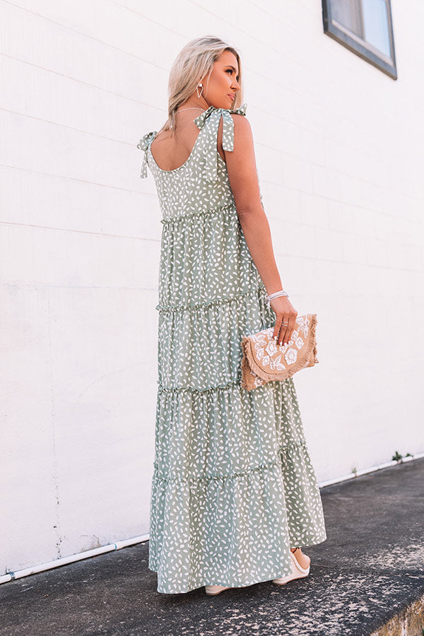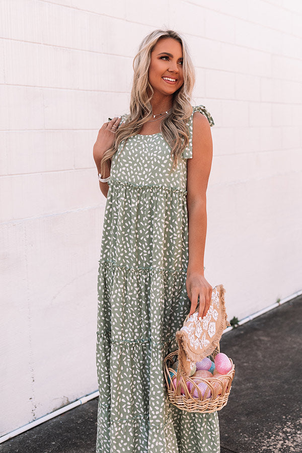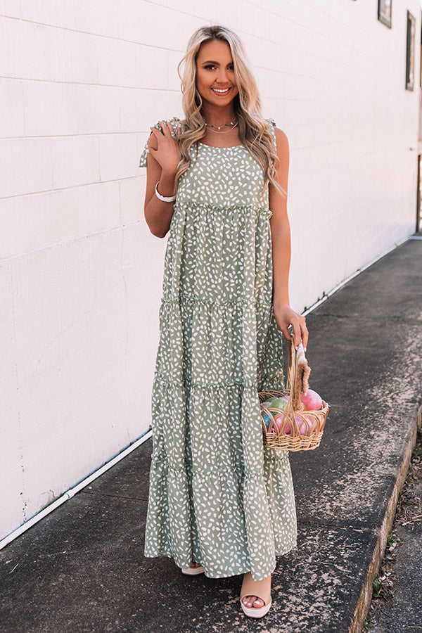 Fly high in our darling pear colored 'Soaring Hearts' maxi dress featuring lightweight flowy material patterned with a white polka dot print, a scooped neckline and upper back, ruffled accent seams, wide tie shoulder straps, and a relaxed tired silhouette that cascades into an uneven floor-length hemline! Measurements