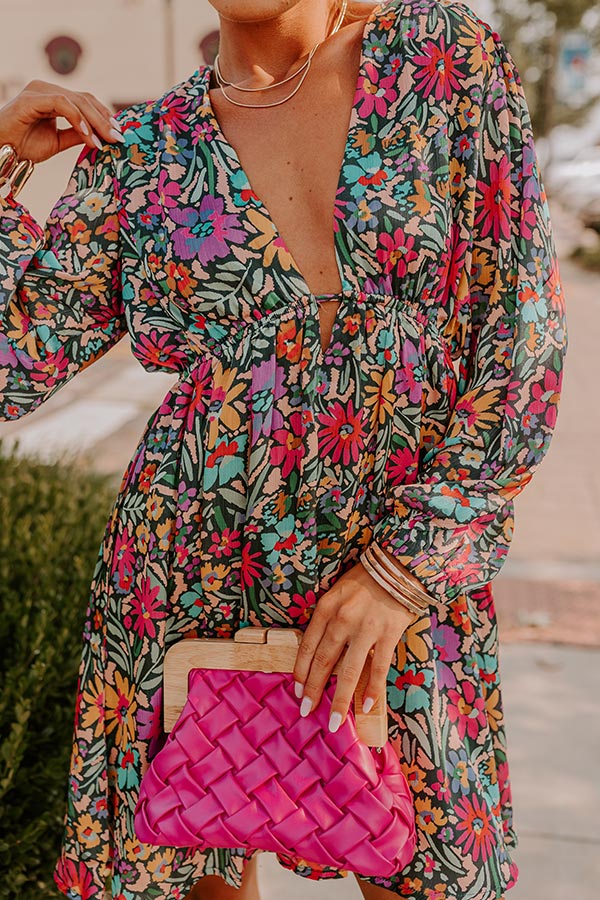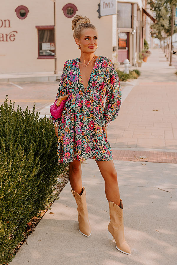 - Perfect for a breezy day, this adorable mini dress will have you falling for florals all over again! Featuring a playful neckline and a vibrant print, it is sure to stand out at any occasion. Step into the season with this stunning dress! - Airy chiffon material with an abstract floral print featuring pink, purple, natural, red, blue, green, yellow, and brown hues - A built-in semi sheer lining at the bodice and skirt - A deep-v neckline and a v-cut back with a tie detail - An elastic waistline - Long, un lined sleeves with elastic cuffs - A flowy yet flattering silhouette that ends in a mini dress length hemline