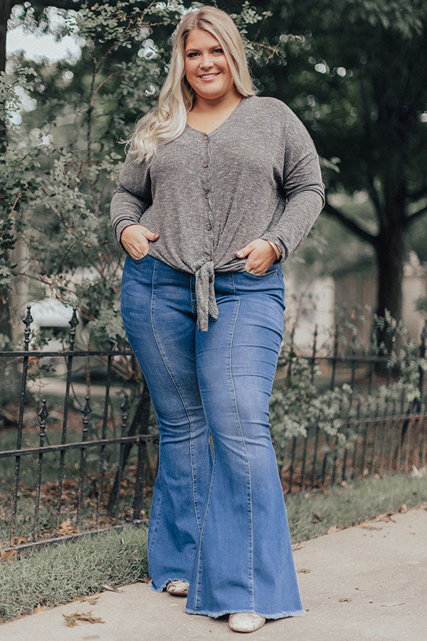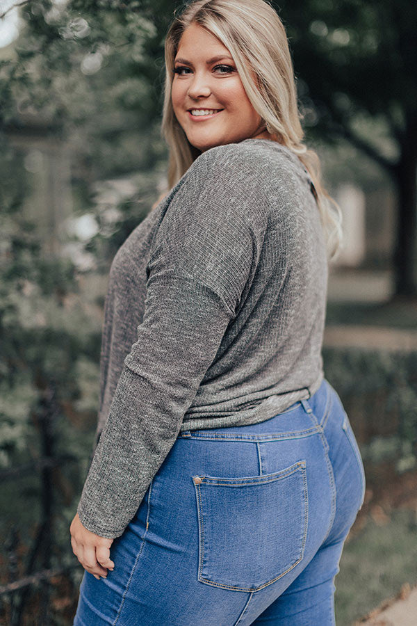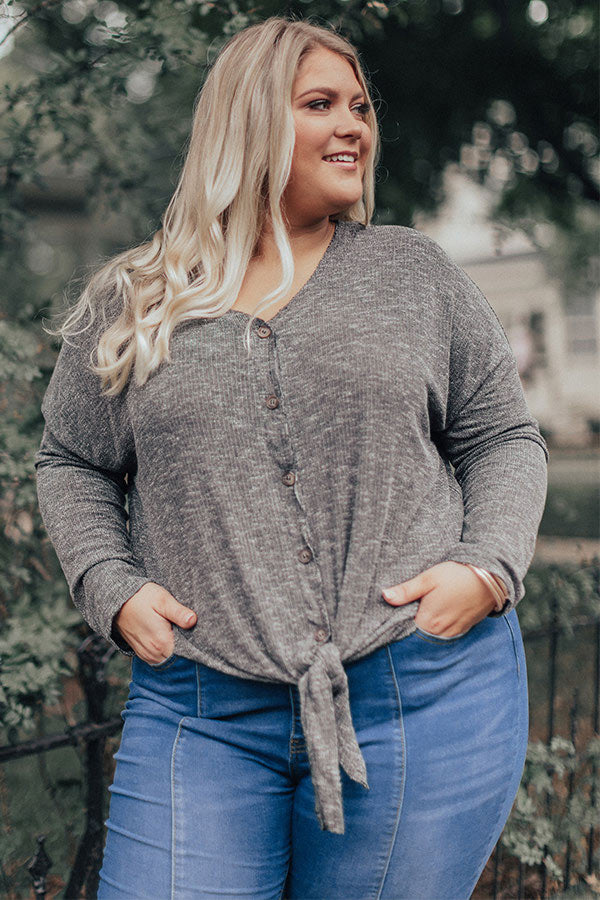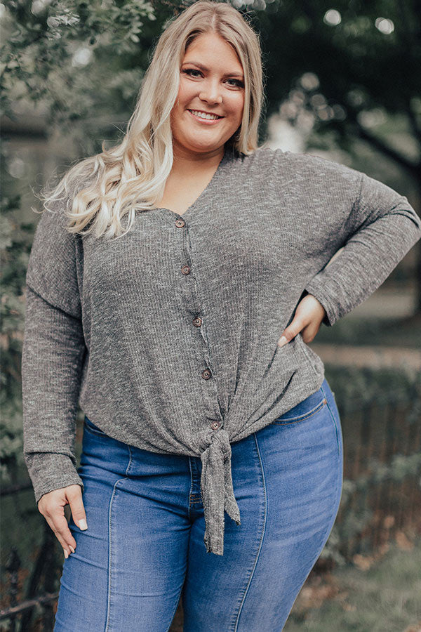 Plus Size - You won't be able to wait for this dark grey top to make its "social debut" before buying it with its lightweight subtly ribbed material, long fitted sleeves, button up bodice with a v-cut neckline, and a relaxed silhouette that falls into a knotted front hemline and a rounded back hem! We have styled this basic fall essential with some oversized denim flares and a neutral pointed bootie, but you can also wear it under our "Take Me To The Mountains Vest in Olive" with some distressed black skinnies, our "Front Page Worthy Felt Hat in Olive," and a black backpack and peep toe heels!