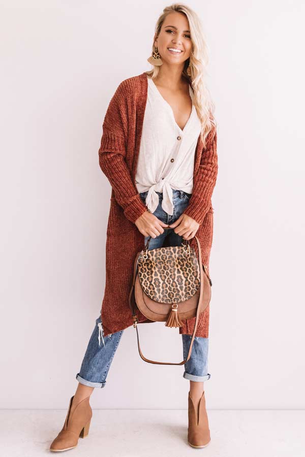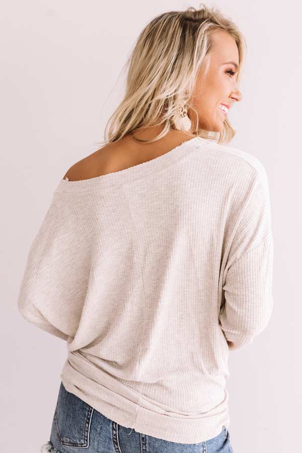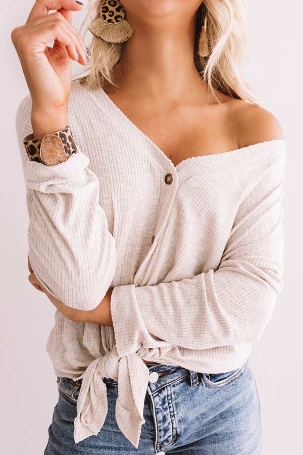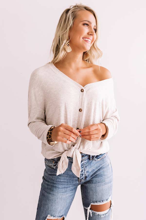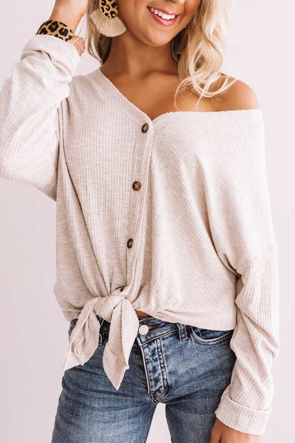 You won't be able to wait for this stone colored top to make its "social debut" before buying it with its lightweight material with subtle ribbed detailing, long fitted sleeves, tortoiseshell button up bodice with a v-cut neckline, and relaxed silhouette that falls into a knotted front hemline and a rounded back hem! We have styled this casual transitional piece under a fall colored cardigan with some distressed ankle skinnies, neutral booties, and a leopard crossbody, but you can also wear it with some colored flares, "The Seraphina Faux Leather Wedge in Taupe," and our "Plans In Paris Wool Hat in Taupe!"
