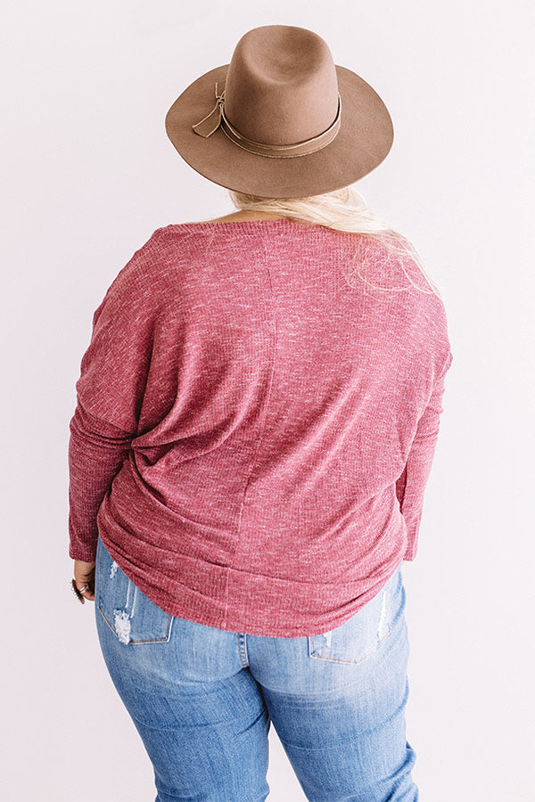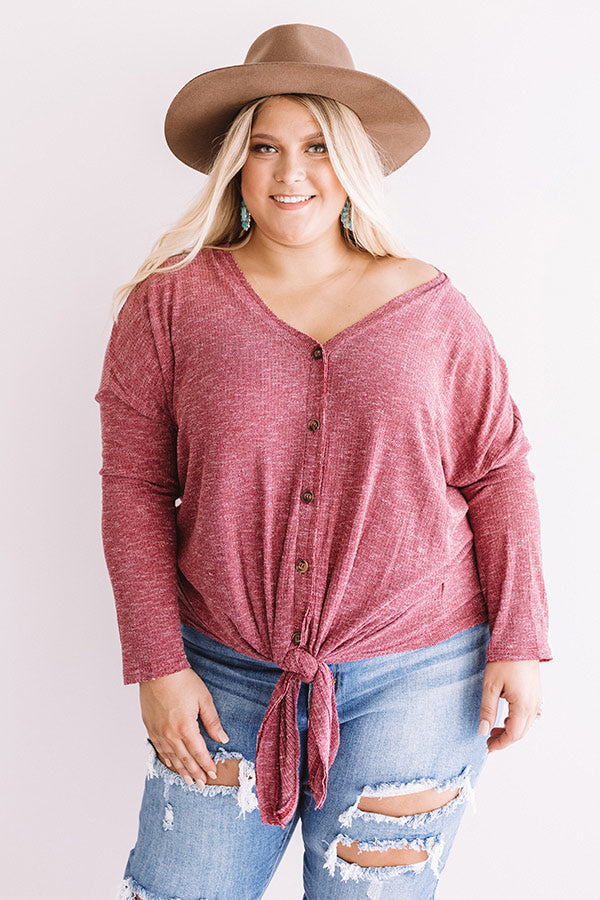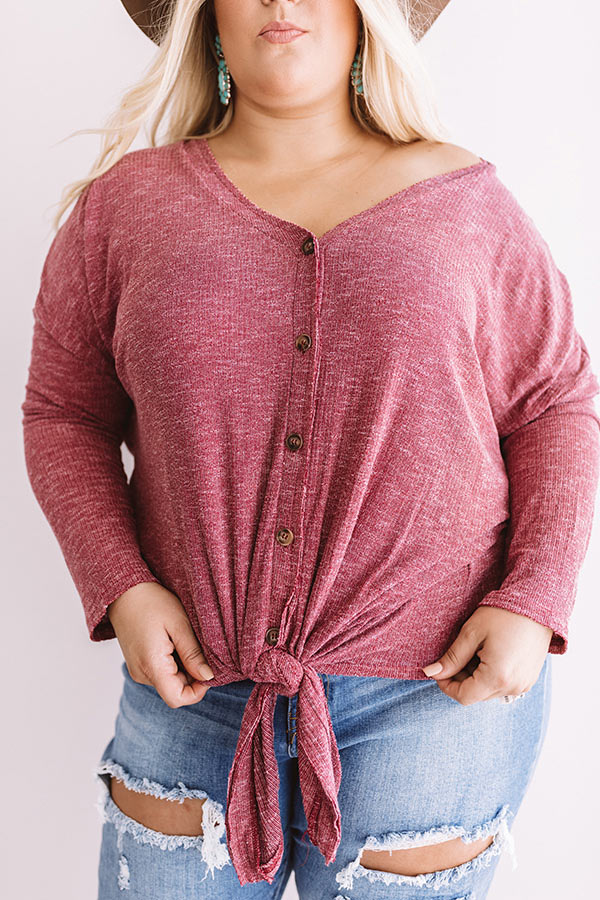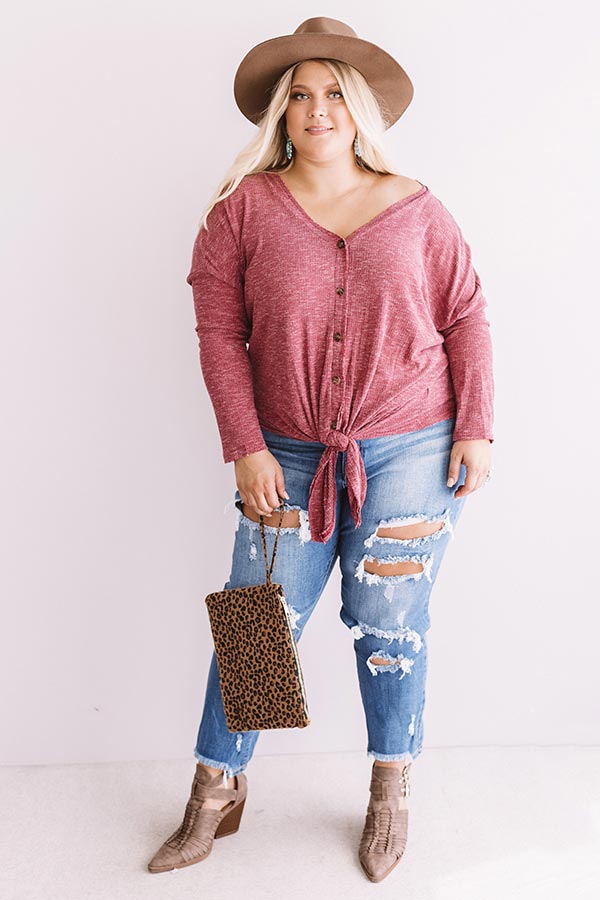 Plus Size - You won't be able to wait for this wine colored top to make its "social debut" before buying it with its lightweight subtly ribbed material, long fitted sleeves, button up bodice with a v-cut neckline, and a relaxed silhouette that falls into a knotted front hemline and a rounded back hem! We have styled this piece with some distressed ankle skinnies, a leopard clutch, and a neutral pointed bootie and faux suede hat, but you can also wear it with some black flares, "The Middleton Heel in Wine," and our "Savvy In The City Knit Scarf in Black!"