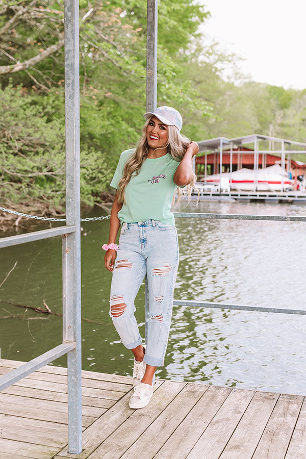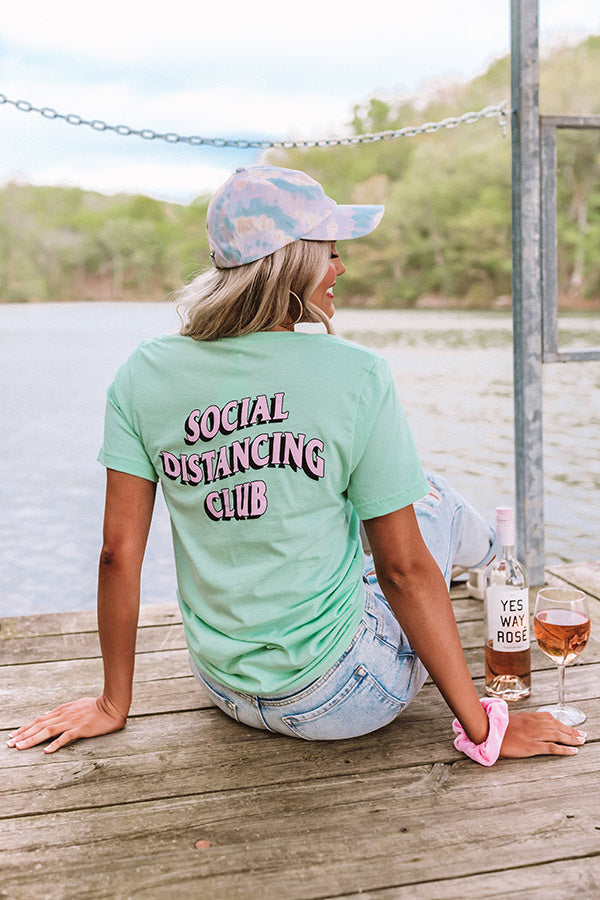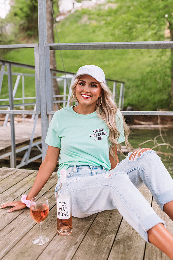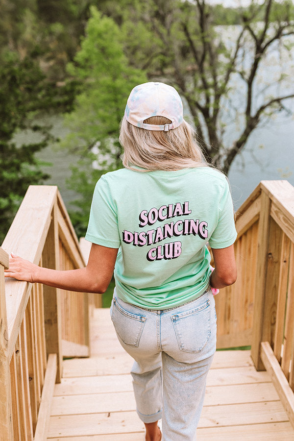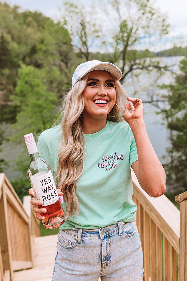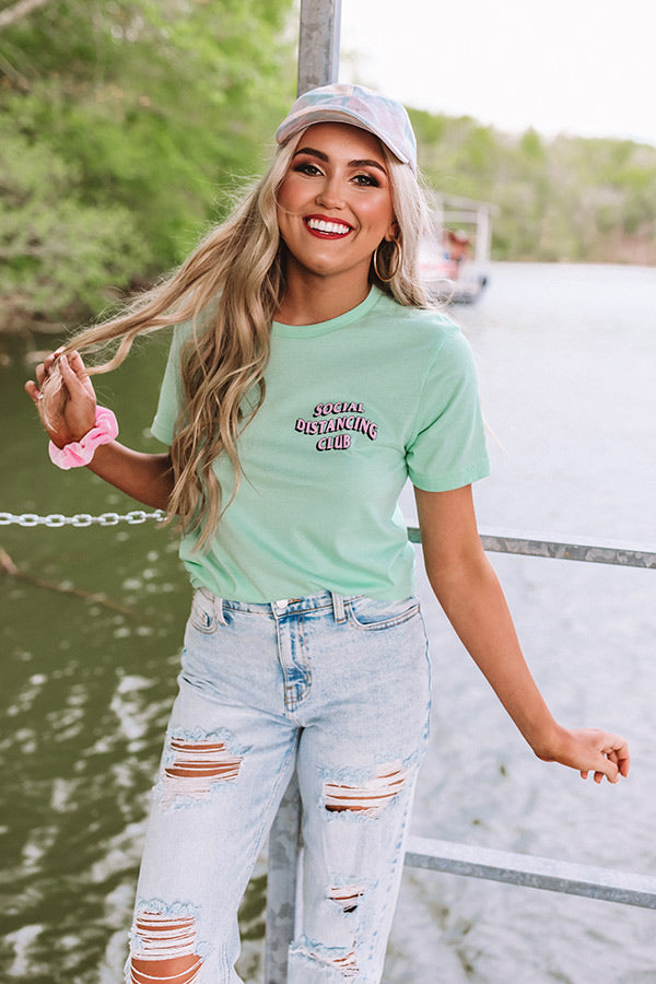 Social distance in style with this trendy mint colored tee featuring soft lightweight material with adorable pink graphic lettering, a high rounded neckline, short loose sleeves, and a relaxed silhouette that falls into a straight hemline! This cutie pairs perfectly with some distressed ankle skinnies, a matching tie dye baseball cap, and sneakers, but you can also with some black joggers, "The Karlie Perforated Bootie in Blush," and "The Essential Faux Leather Backpack in Blush!" Measurements