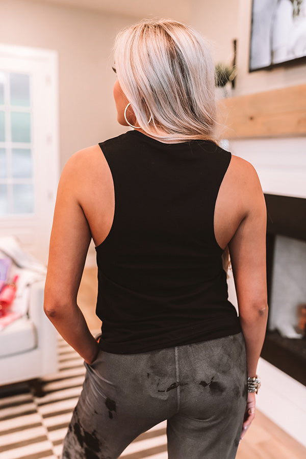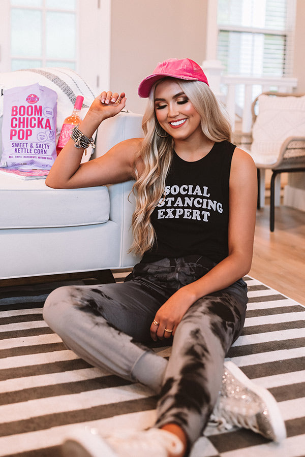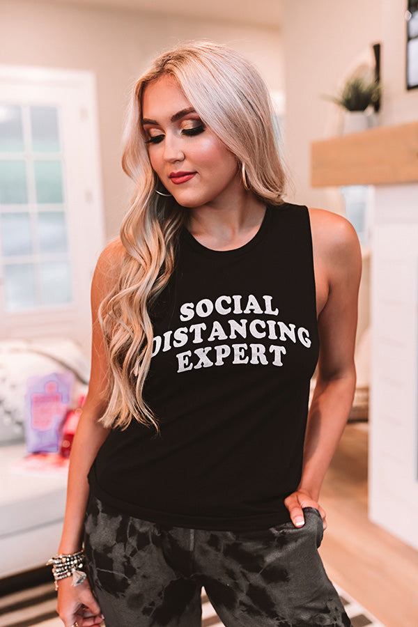 Our trendy black "Social Distancing Expert Tank" features soft lightweight material with bold white block lettering on the front, a high rounded neckline, wide 3-inch sleeveless shoulder straps, and a relaxed silhouette that falls into a straight hemline! You can style this cutie a variety of ways, like with some tie dye joggers, a baseball cap, and glittering sneakers, or you can wear it layered under a cropped jean jacket with some frayed white shorts, "The Karlie Perforated Bootie in Black," and our "Right On Cue Fringe Crossbody in White!" Measurements