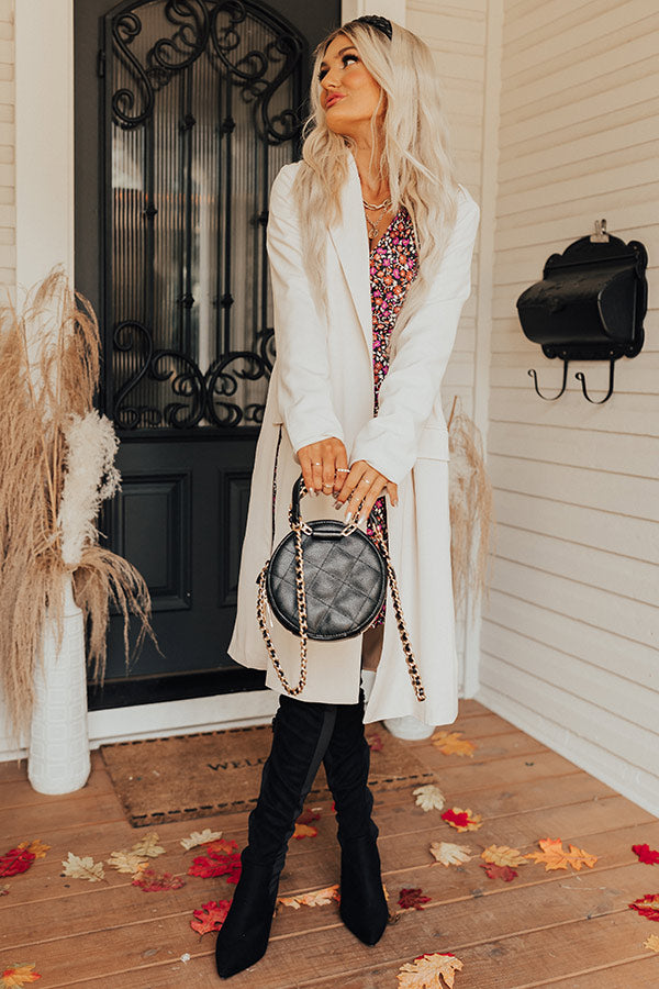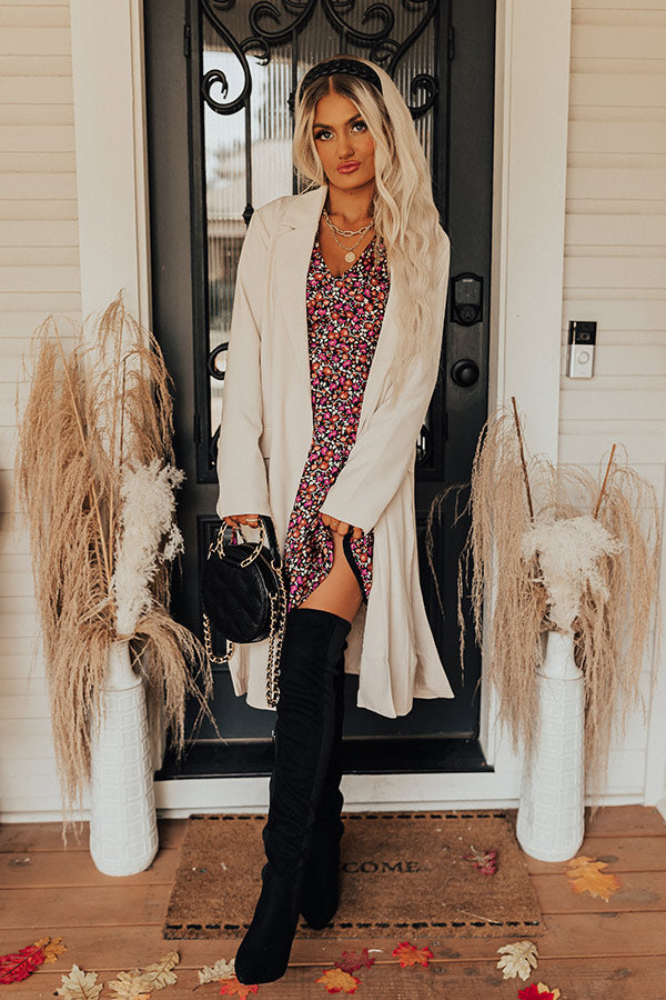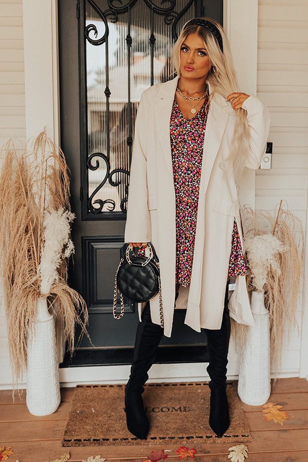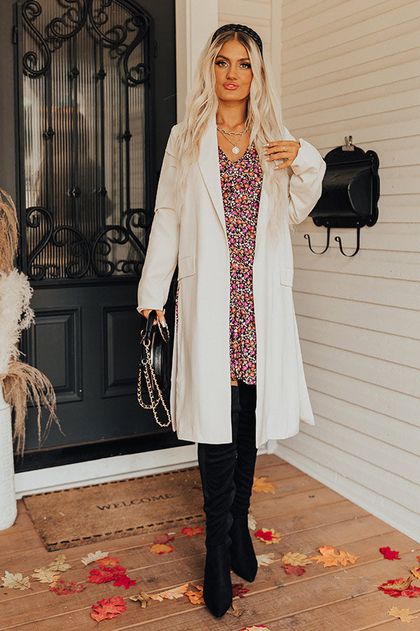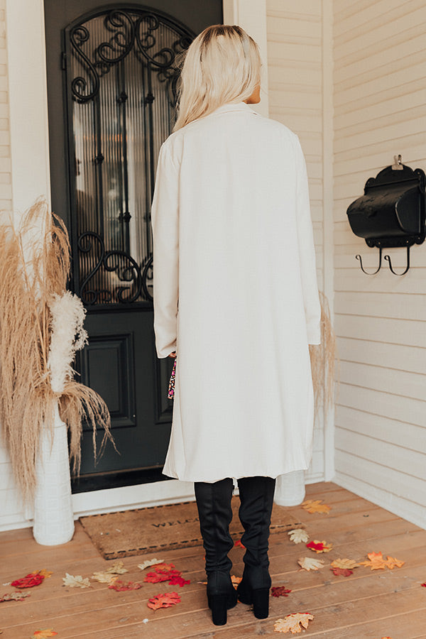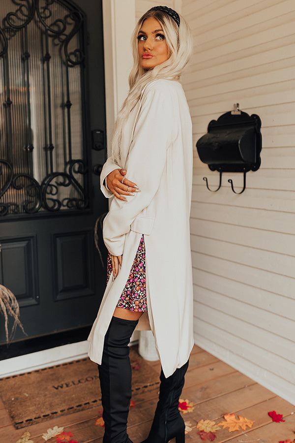 Layer up in the chicest of ways with our upscale ivory hued 'Social Hour' coat featuring lightweight material, long sleeves, an open front with a collared neckline, and a draped silhouette that ends in a straight knee-length hemline with high accent side slits!