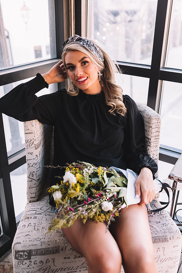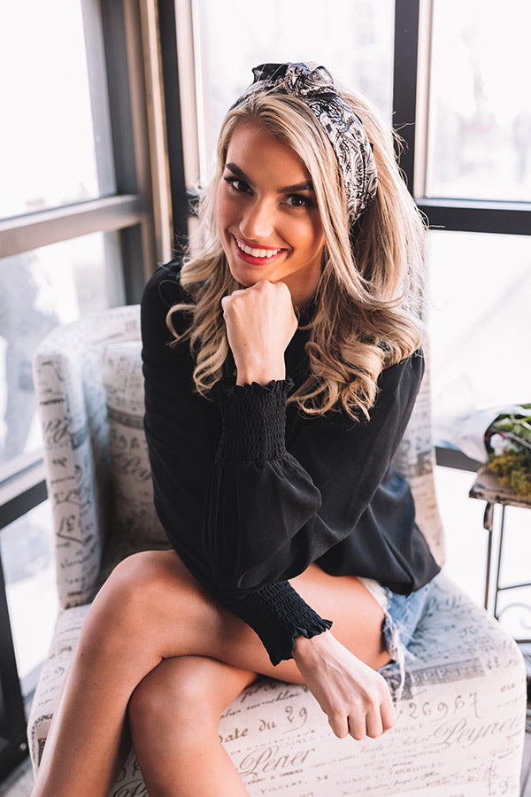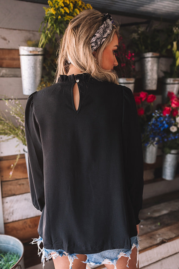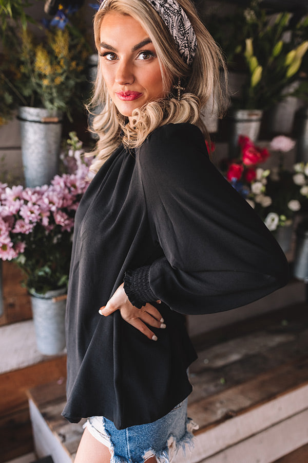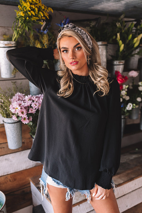 There is no better piece to take you from nine to wine than our chic black 'Socialite In The City Shift Top' featuring lightweight material, a ruffled collar neckline, long bishop sleeves with wide smocked cuffs, a keyhole accented upper back with a button closure, and a flattering silhouette that falls into a rounded hemline! Measurements