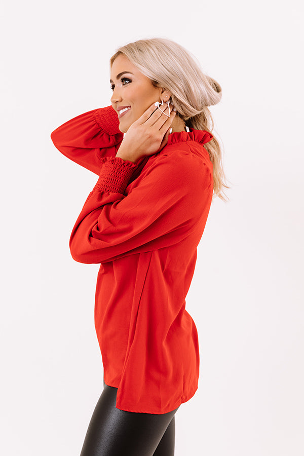 There is no better piece to take you from nine to wine than our chic scarlet 'Socialite In The City Shift Top' featuring lightweight material, a ruffled collar neckline, long bishop sleeves with wide smocked cuffs, a keyhole accented upper back with a button closure, and a flattering silhouette that falls into a rounded hemline!