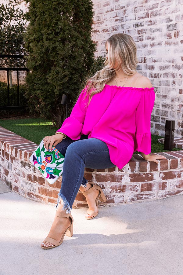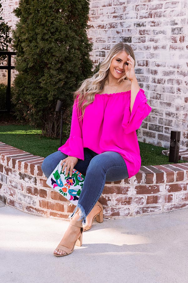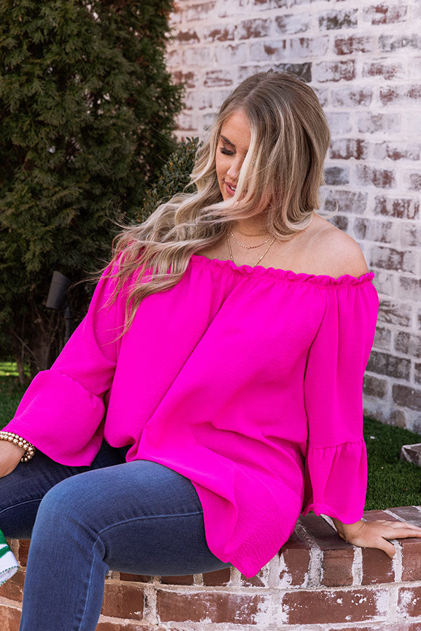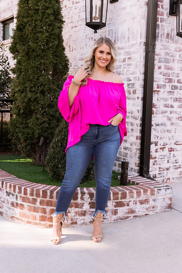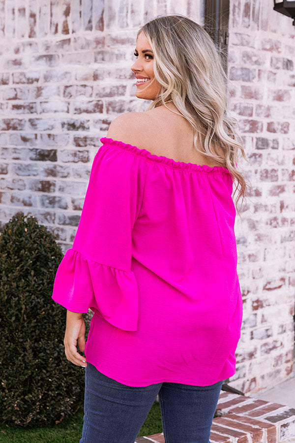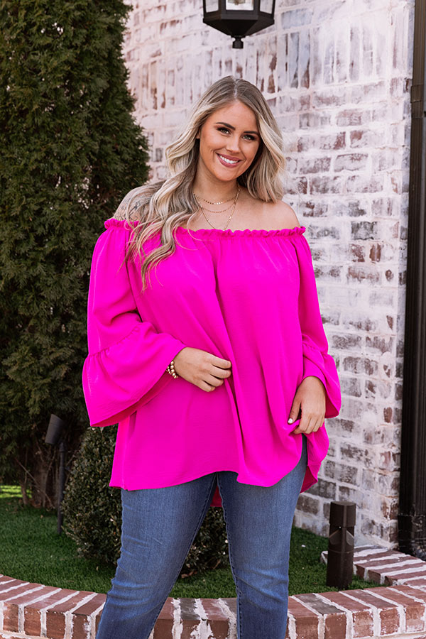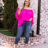 Plus Size - You are sure to turn heads when you wear our vibrant fuchsia 'Society Pages' shift top featuring lightweight breezy material, an elastic off shoulder fit with a straight ruffle-trim neckline, loose drop sleeves with flared cuffs, and a relaxed silhouette that falls into a straight hemline! Measurements