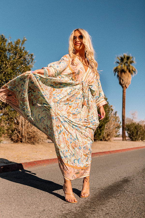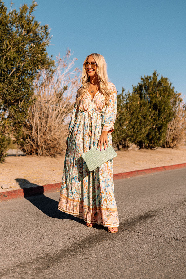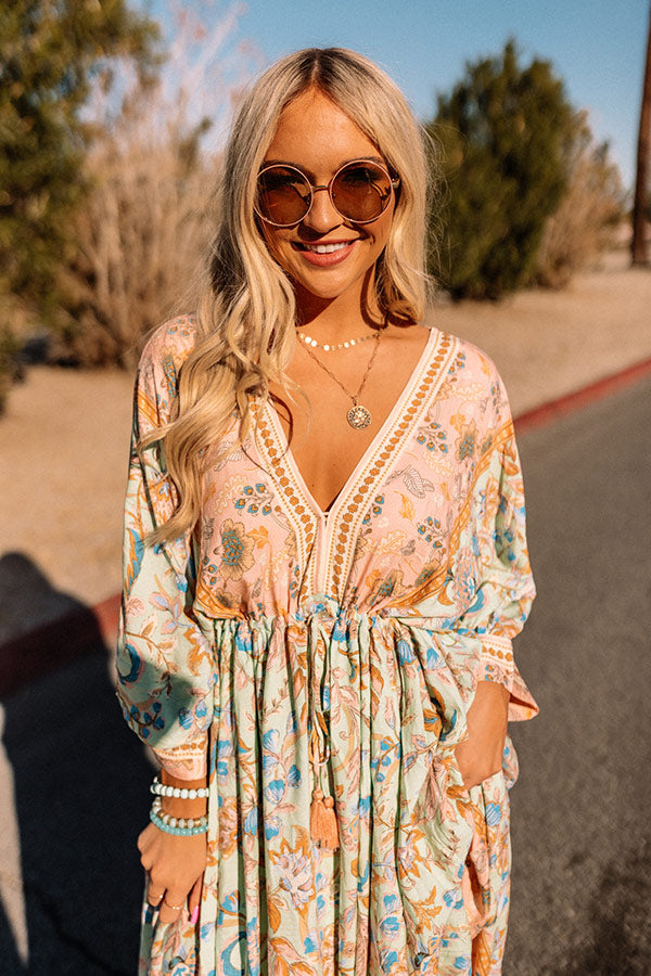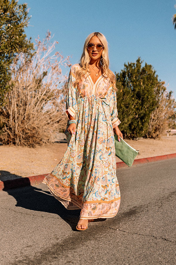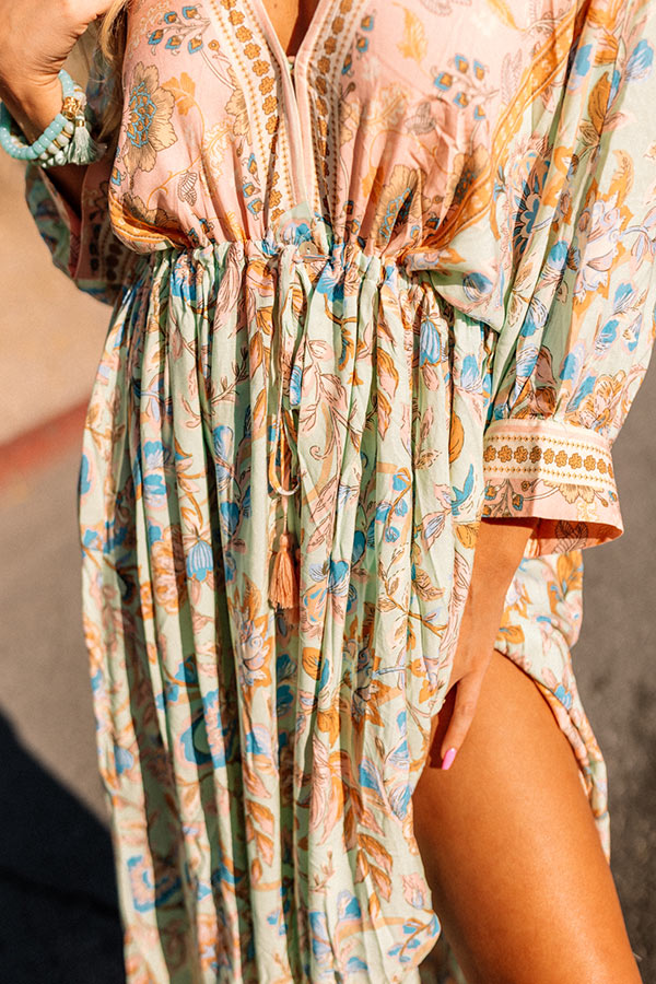 Twirl through summer in this perfect piece! Our stunning 'Society Sweet Maxi Dress' featuring lightweight material featuring lightweight breezy material patterned with an intricate peach, blue, and light green hued floral print, a v-cut neckline and upper back with a tie closure, loose 3/4-length sleeves, a cinched waistline with a tassel tie closure, and a relaxed skirt silhouette that falls into a straight ankle-length hemline!