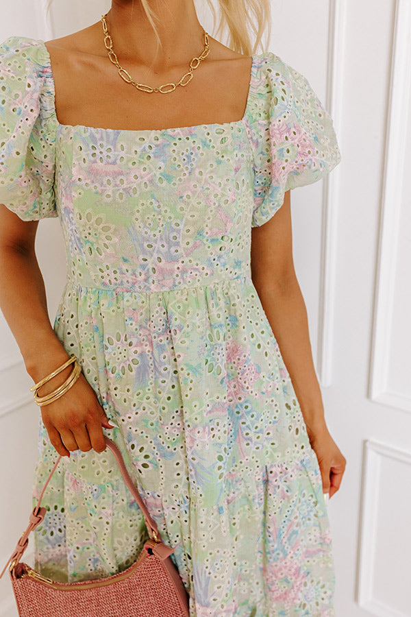 - Lightweight eyelet material with an abstract floral print featuring pink, blue, and purple pastel hues