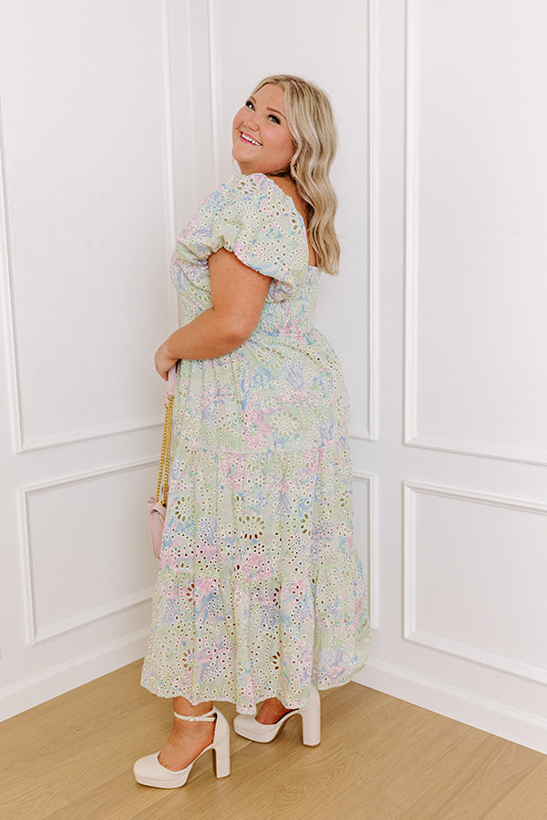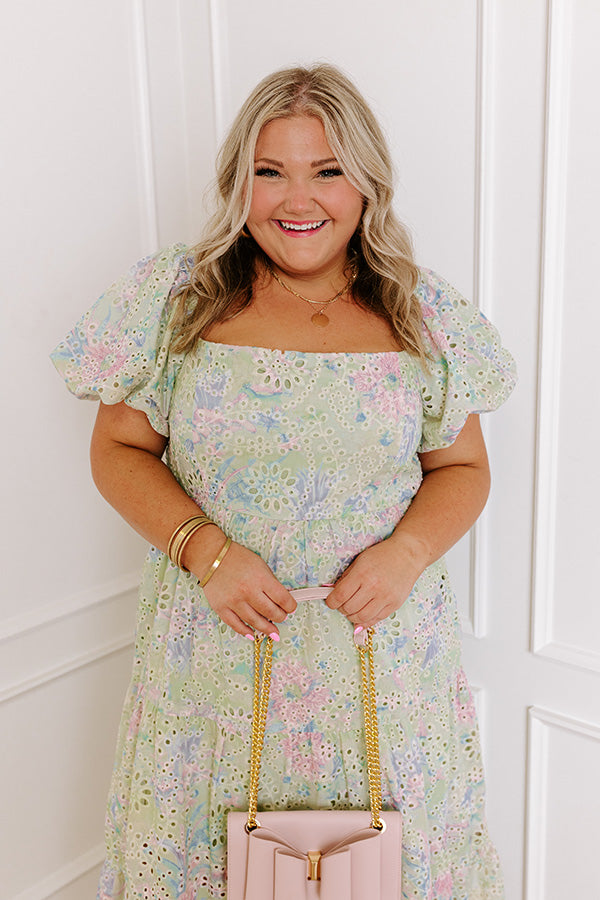 - Lightweight eyelet material with an abstract floral print featuring pink, blue, and purple pastel hues