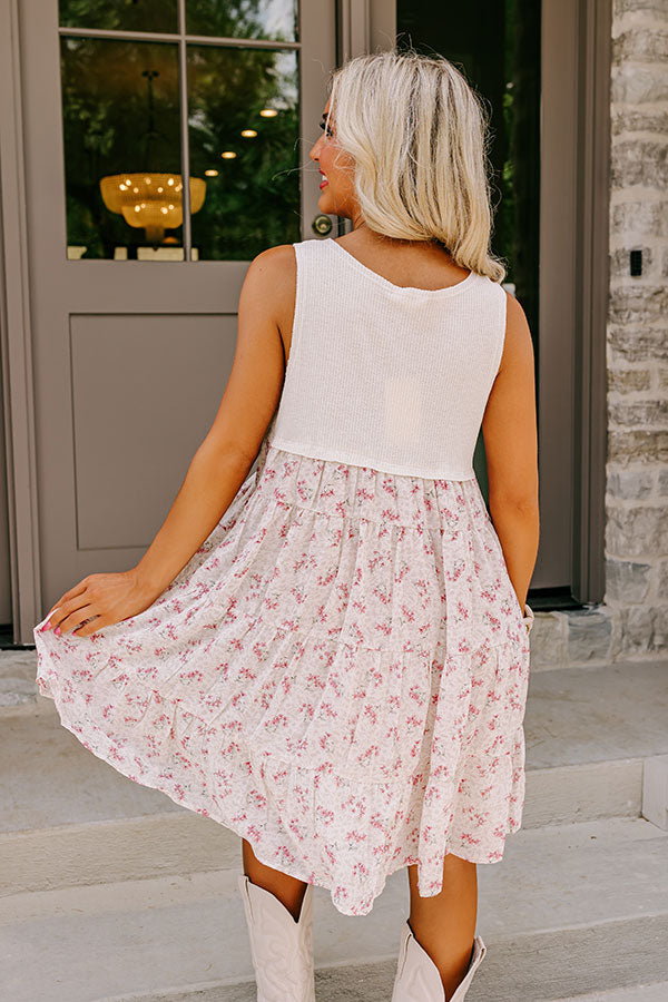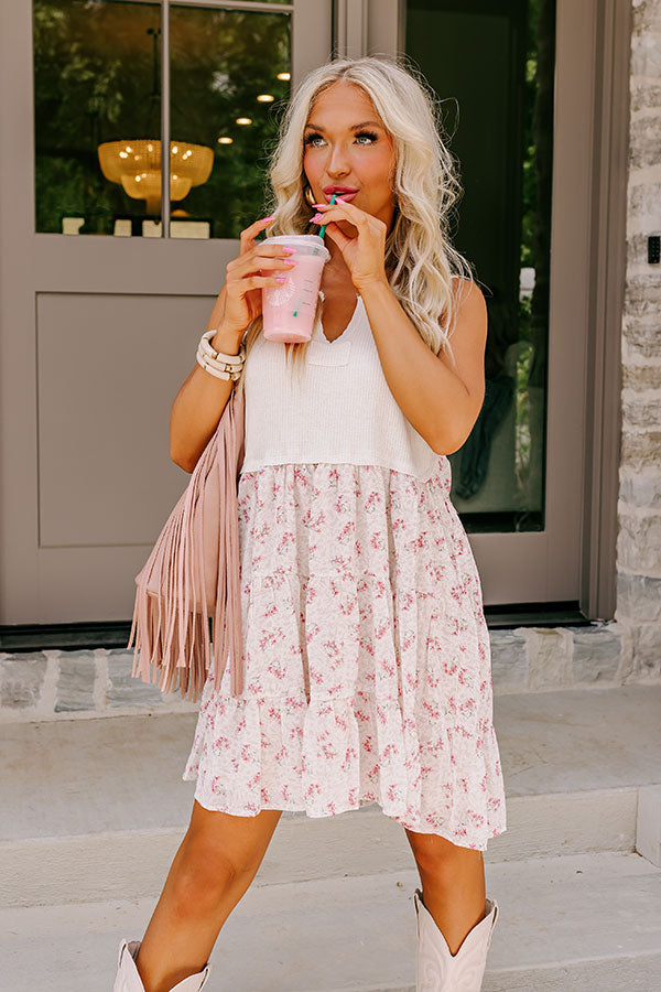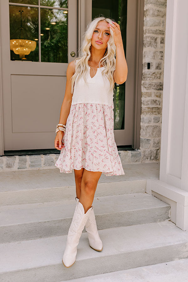 Stand out in the crowd with this adorable cream hued 'Soho Endeavors' dress featuring lightweight flowy material, a ribbed knit bodice and a floral patterned skirt silhouette, a scooped v-cut neckline, wide sleeveless shoulder straps, and a straight mid-thigh length silhouette!
