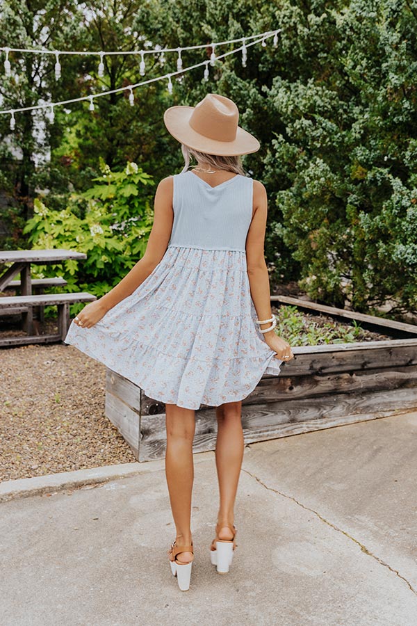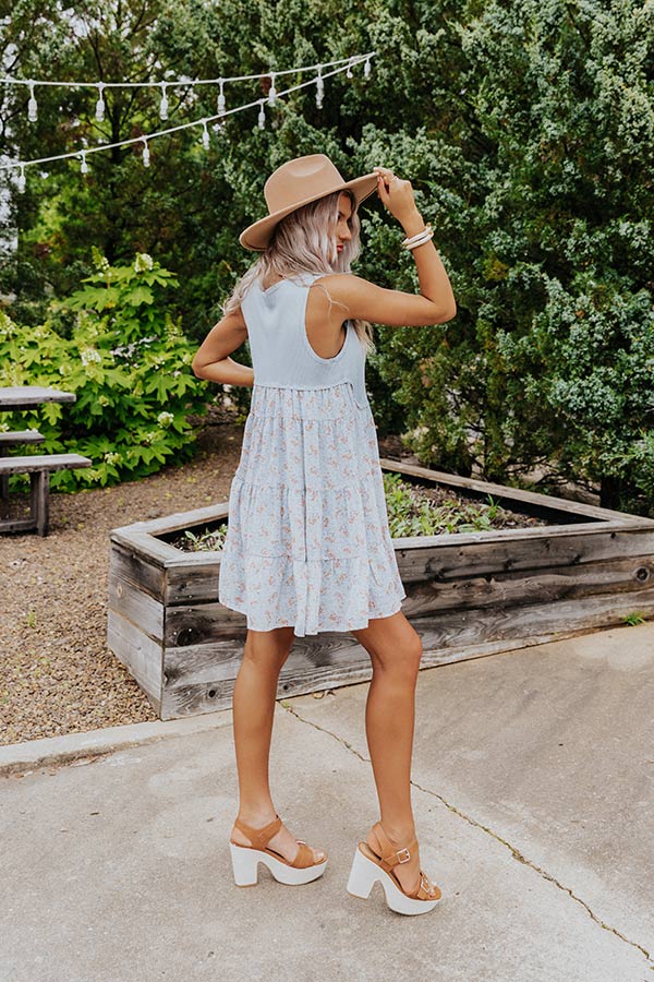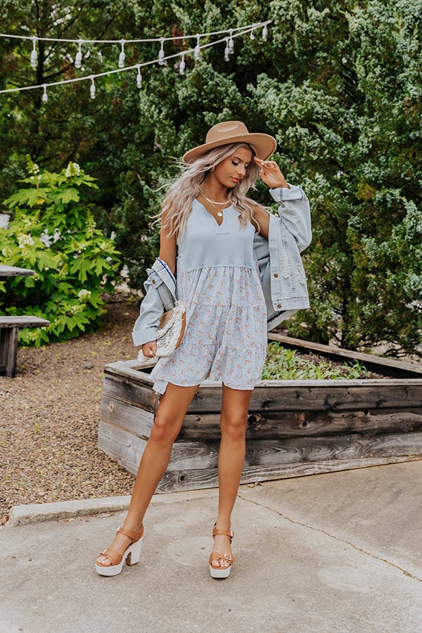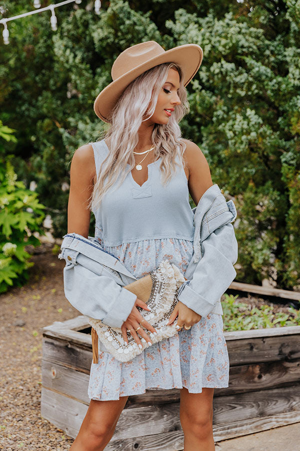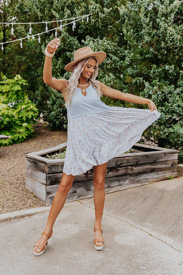 Stand out in the crowd with this adorable sky blue 'Soho Endeavors' dress featuring lightweight flowy material, a ribbed knit bodice and a floral patterned skirt silhouette, a scooped v-cut neckline, wide sleeveless shoulder straps, and a straight mid-thigh length silhouette!