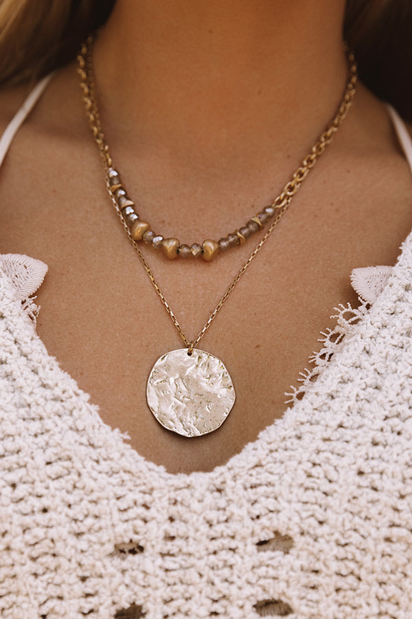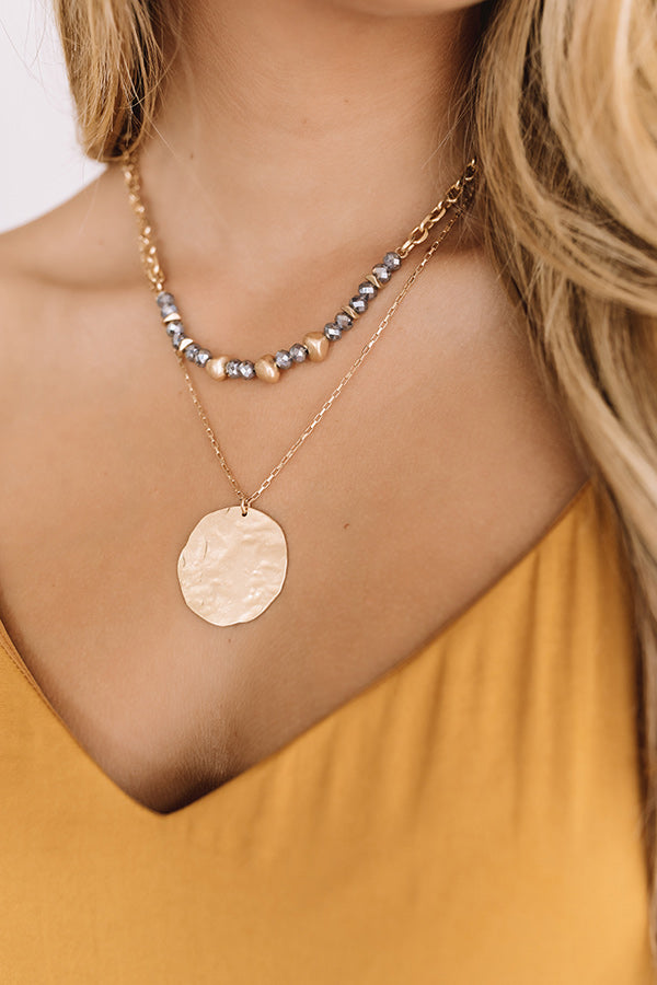 Go with the "Soho flow" in this dainty necklace featuring two layered gold chains with slate colored beads and a large stamped circle charm!