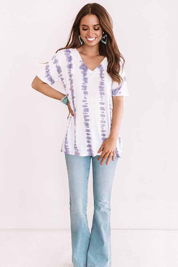 You will feel nothing but happiness in this tie dye tee featuring a v-neck with a t-shirt fit and a hem that can be worn knotted or untucked! This lavender top can be styled for summer with a pair of our distressed dark wash shorts, our "Mara Sandal in White," and our "Cabana Fever Tassel Earrings in Lavender!" Measurements