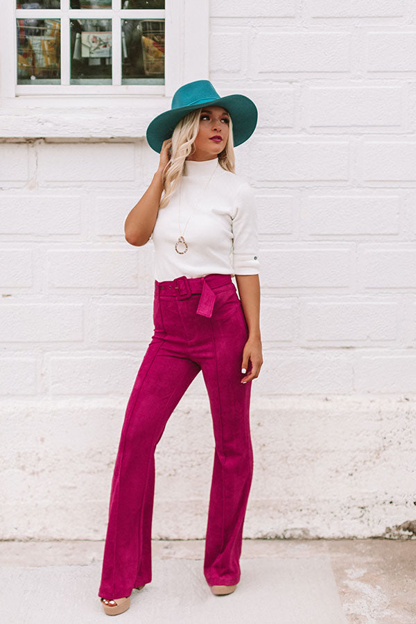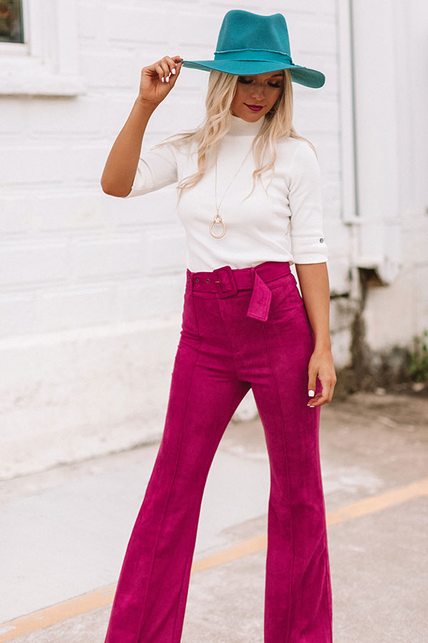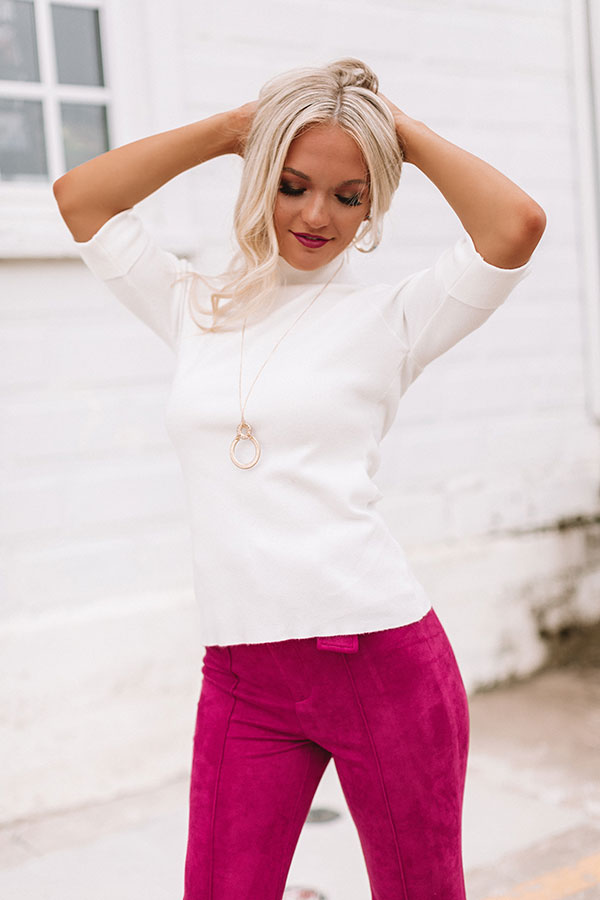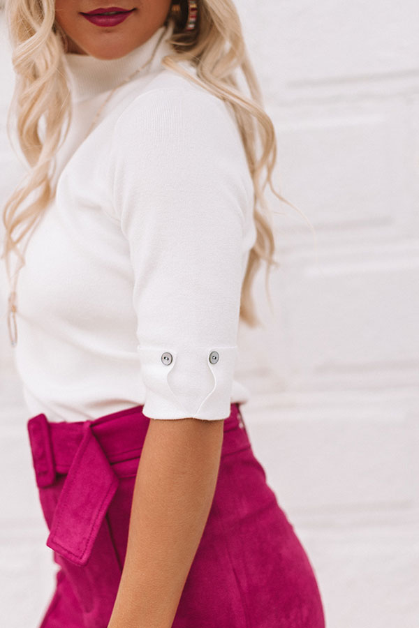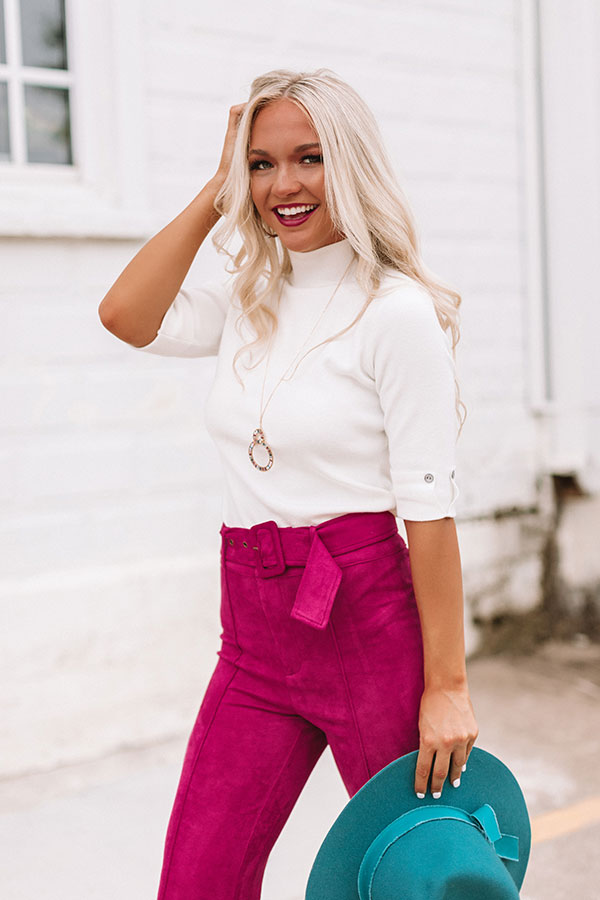 You will look so polished when you wear this white sweater top featuring a high turtle neck, half length sleeves with rolled split cuffs and button closures, and a form fitting bodice with a straight hemline that looks stunning tucked into some high waist pants! That's why we have styled this piece with some gorgeous faux suede fuchsia flares, a neutral platform heel and faux suede hat, but it can also be paired with some distressed skinnies, "The Scout Faux Suede Peep Toe Heel in Stone," and our "Garden Party Luxe" hair scarf! Measurements