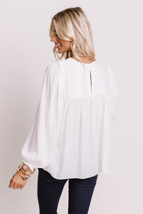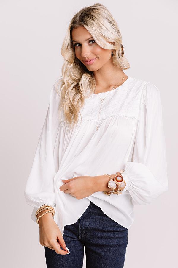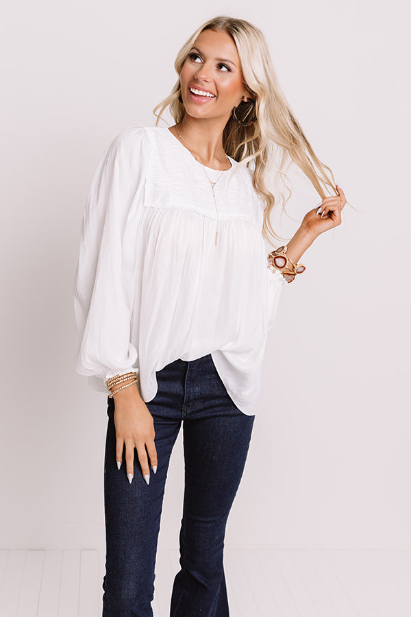 Arrive in style with our elegant white "Soho Shops Shift Top" featuring sleek lightweight flowy material, a high rounded neckline, 3/4-length oversized bubble sleeves with fitted elastic cuffs, a keyhole accented upper back with a button closure, and an ultra relaxed silhouette that falls into a rounded hemline! Measurements