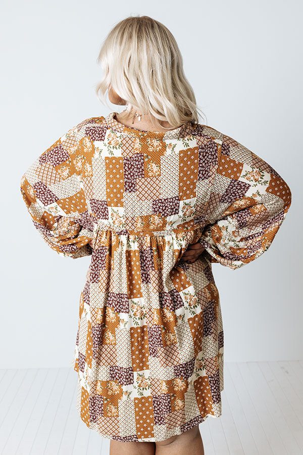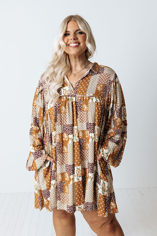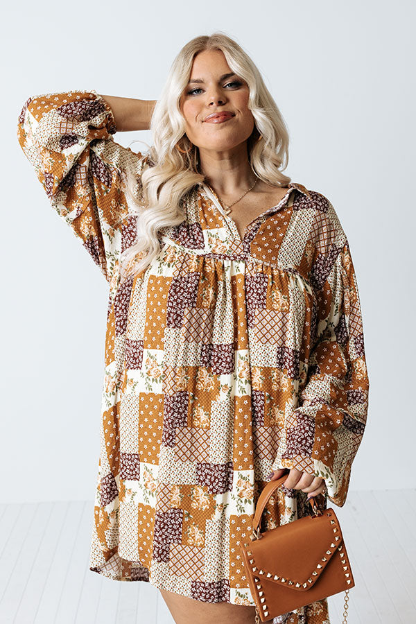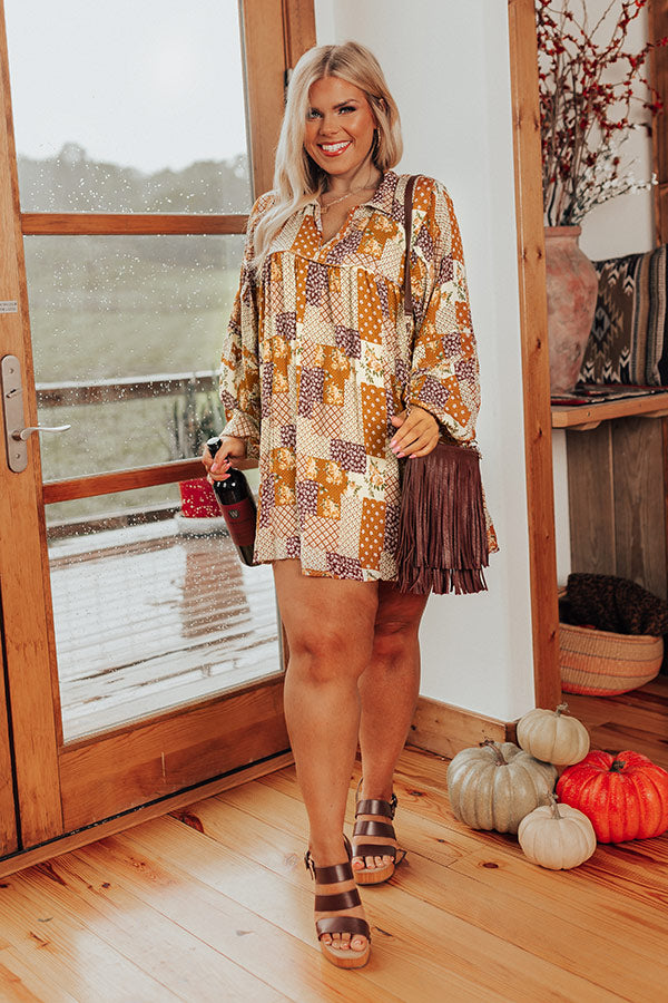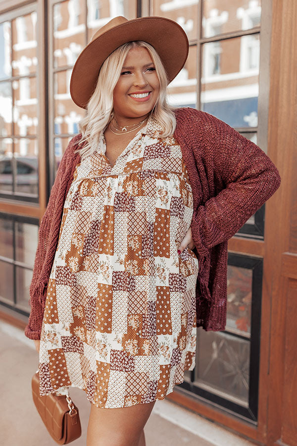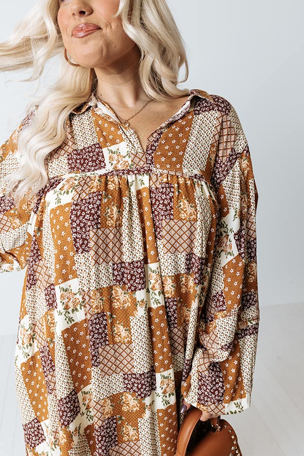 You won't find a sweeter fall dress than this adorable plus size cream hued one featuring lightweight flowy material patterned with a variety of unique rust, brown, and natural hued floral print patchwork , a collared v-cut neckline, long oversized sleeves, low hidden pockets, and a relaxed babydoll silhouette that falls into a straight mid-thigh length hemline!