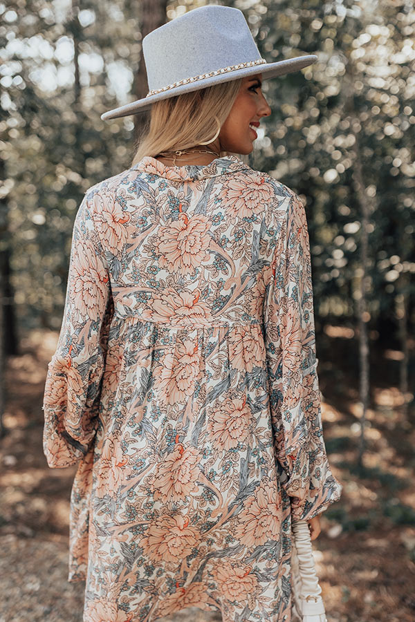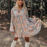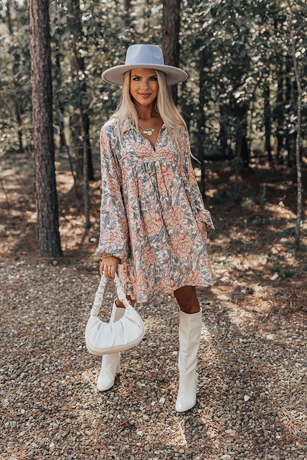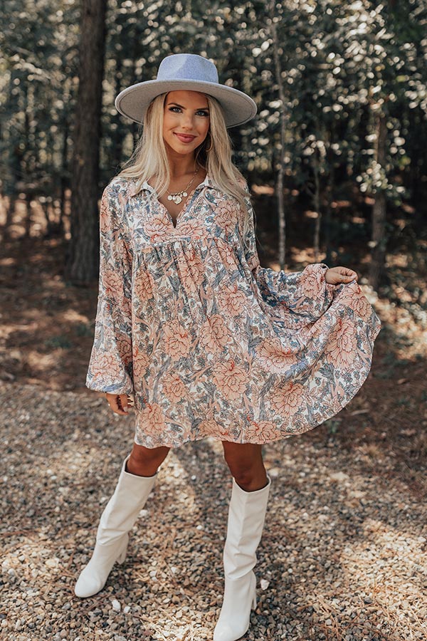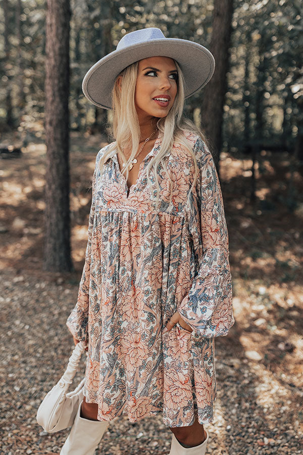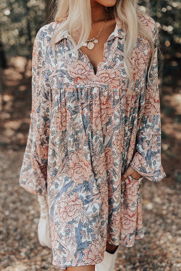 You won't find a sweeter fall dress than this adorable one featuring lightweight flowy material patterned with a light pink/coral and airy blue hued floral print, a collared v-cut neckline, long oversized sleeves, low hidden pockets, and a relaxed babydoll silhouette that falls into a straight mid-thigh length hemline! Measurements