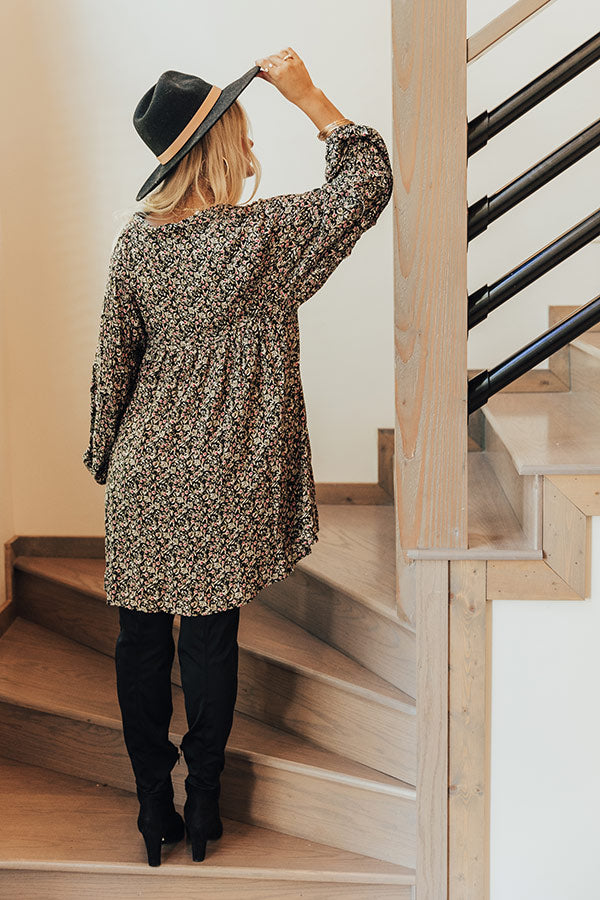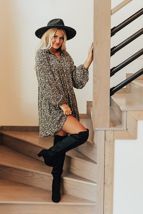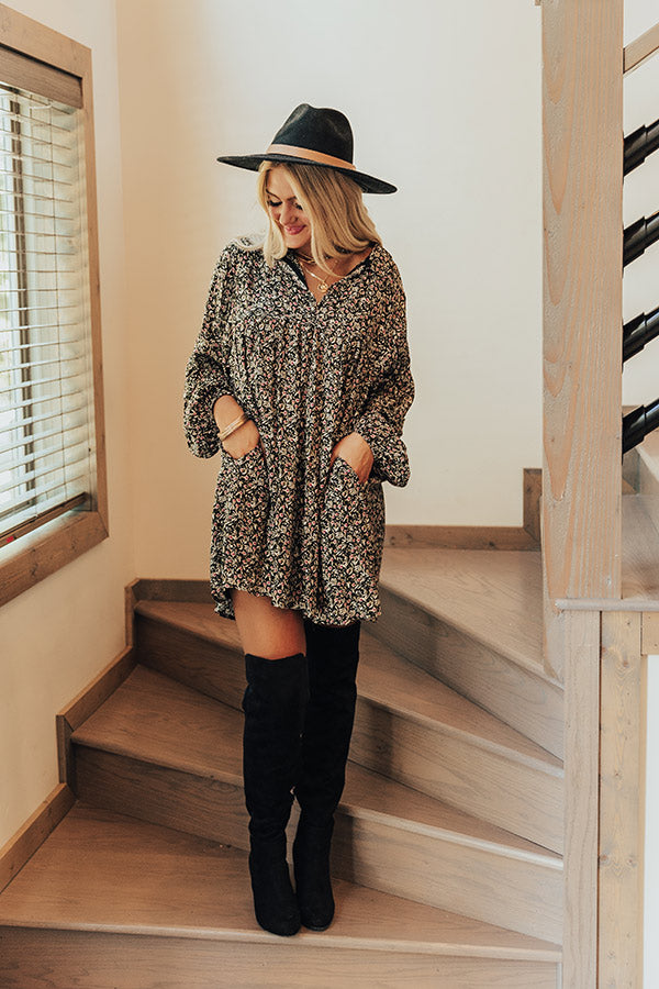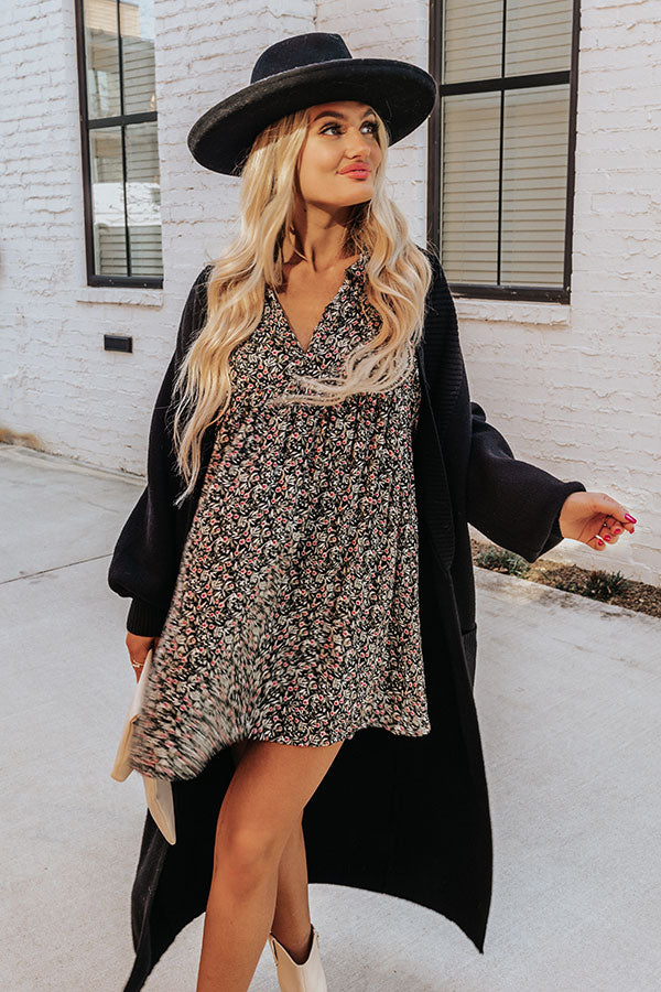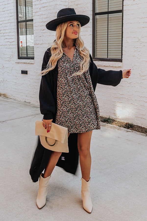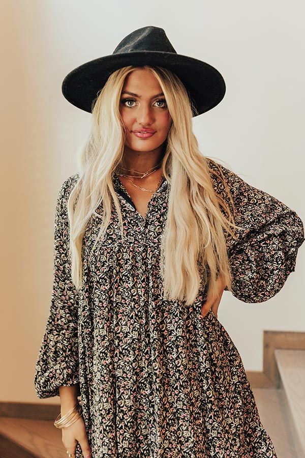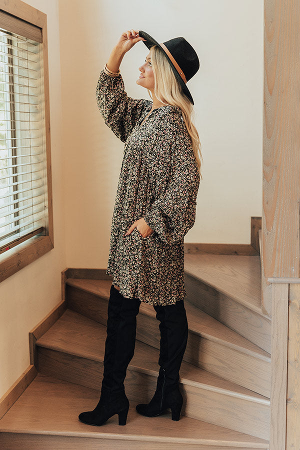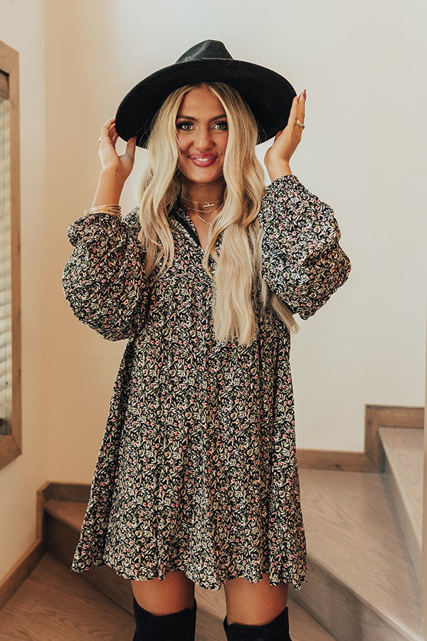 You won't find a sweeter fall dress than this adorable black one featuring lightweight flowy material patterned with a white and pink floral print, a collared v-cut neckline, long oversized sleeves, low hidden pockets, and a relaxed babydoll silhouette that falls into a straight mid-thigh length hemline!