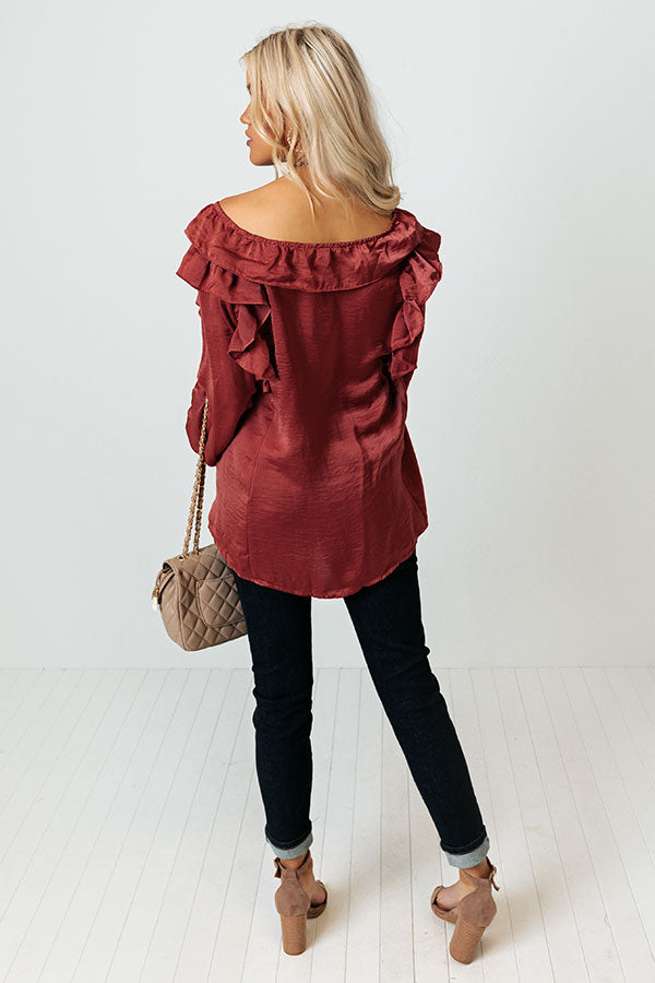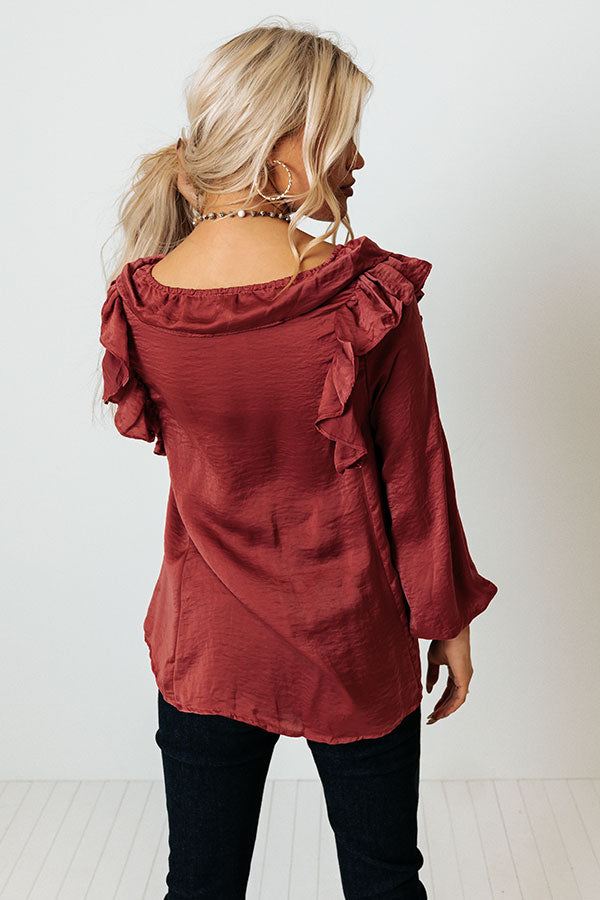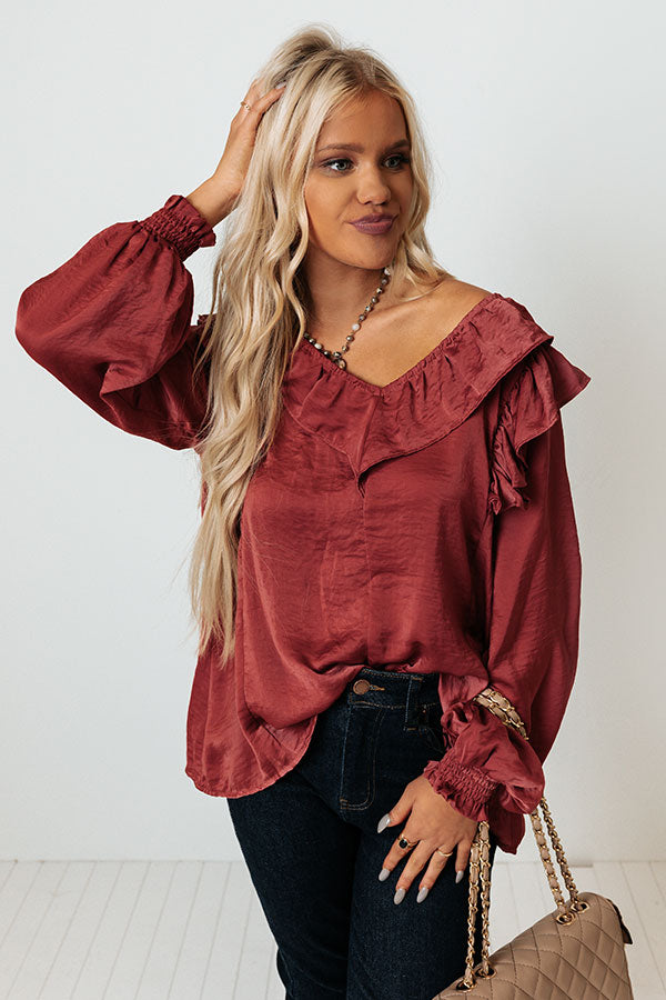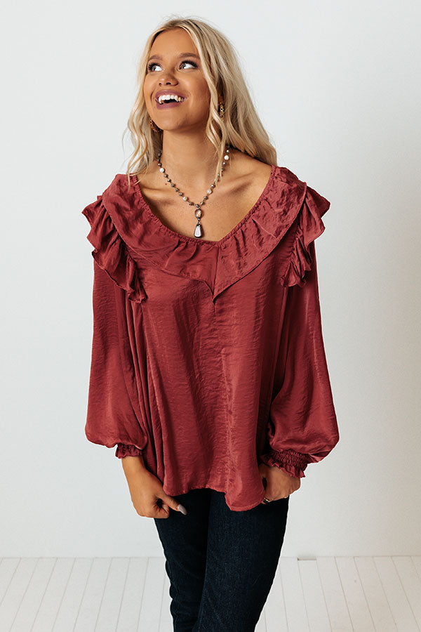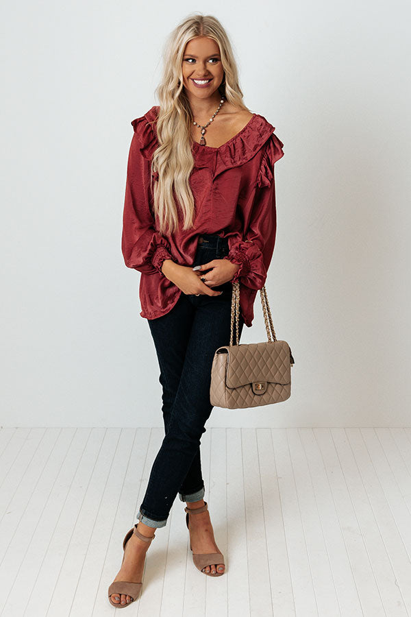 Stay timeless in our classy wine colored 'Soho Sweetness Shift Top' featuring sleek lightweight satin-like material, a v-cut neckline with ruffled trim, long bishop sleeves with smocked cuffs and ruffled accent seams on the shoulders, and a relaxed silhouette that falls into a straight hemline!