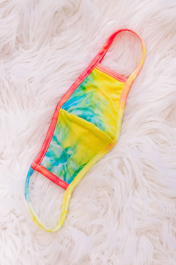 Our "Solo Trip" face mask features lightweight cloth material patterned with blue, pink, and green/yellow hued tie dye and two ear straps!