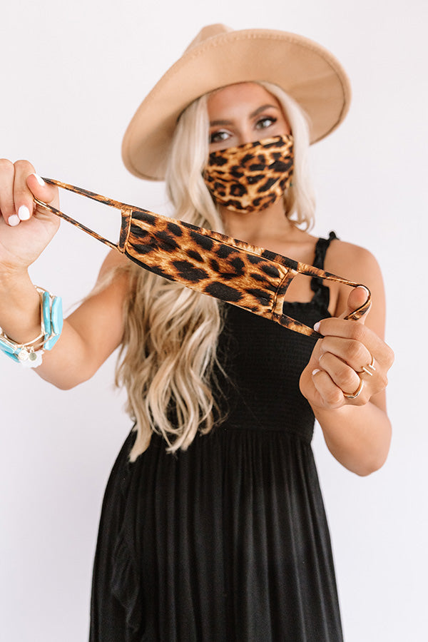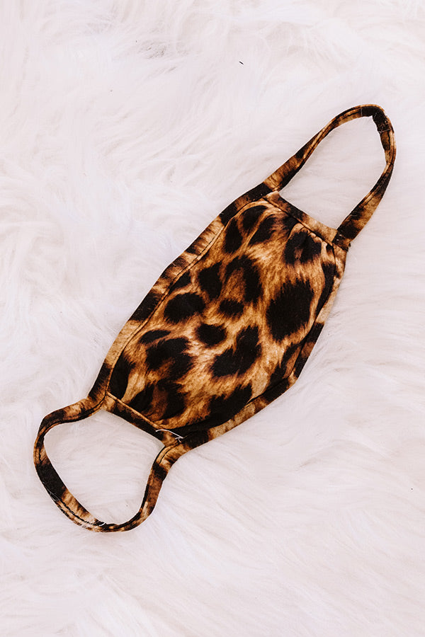 Our brown "Solo Trip" face mask features lightweight cloth material patterned with a black leopard print and two ear straps!