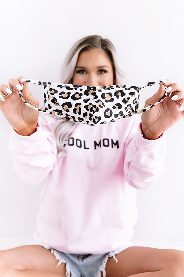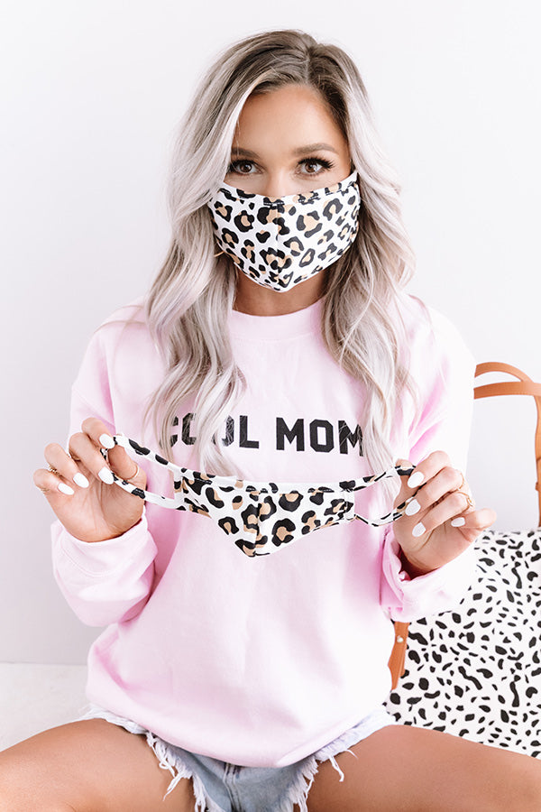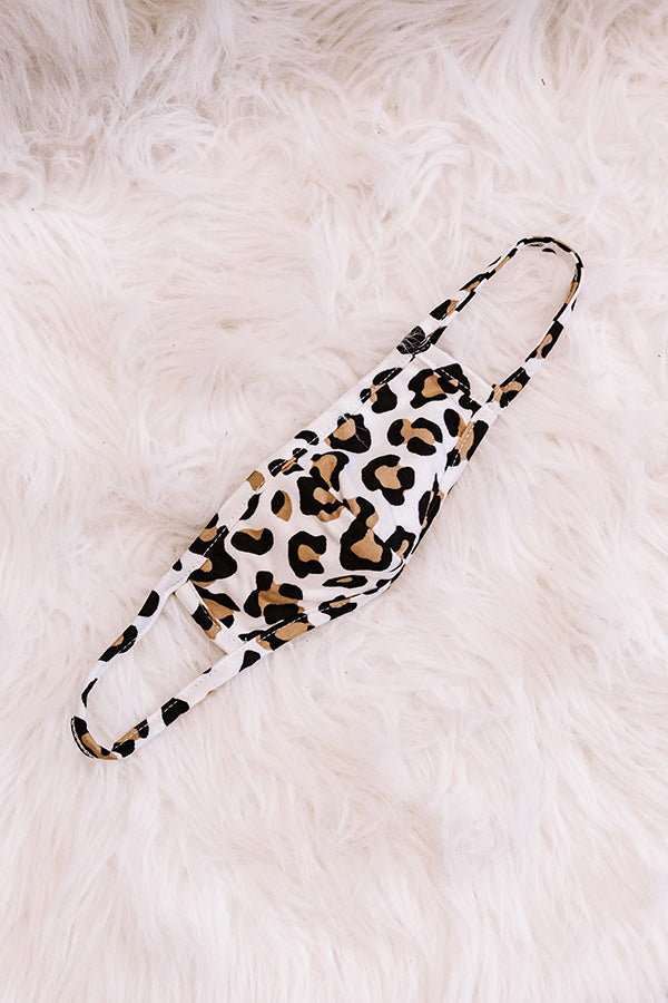 Our children's "Solo Trip" face mask features lightweight cloth material patterned with a white, black, and neutral hued leopard print and two ear straps!