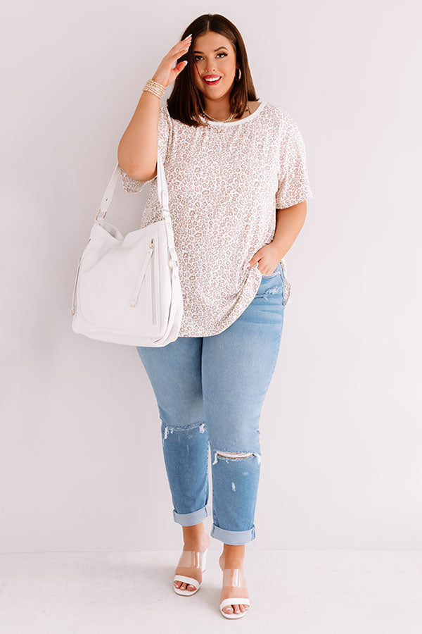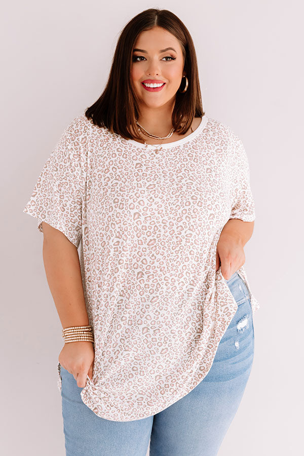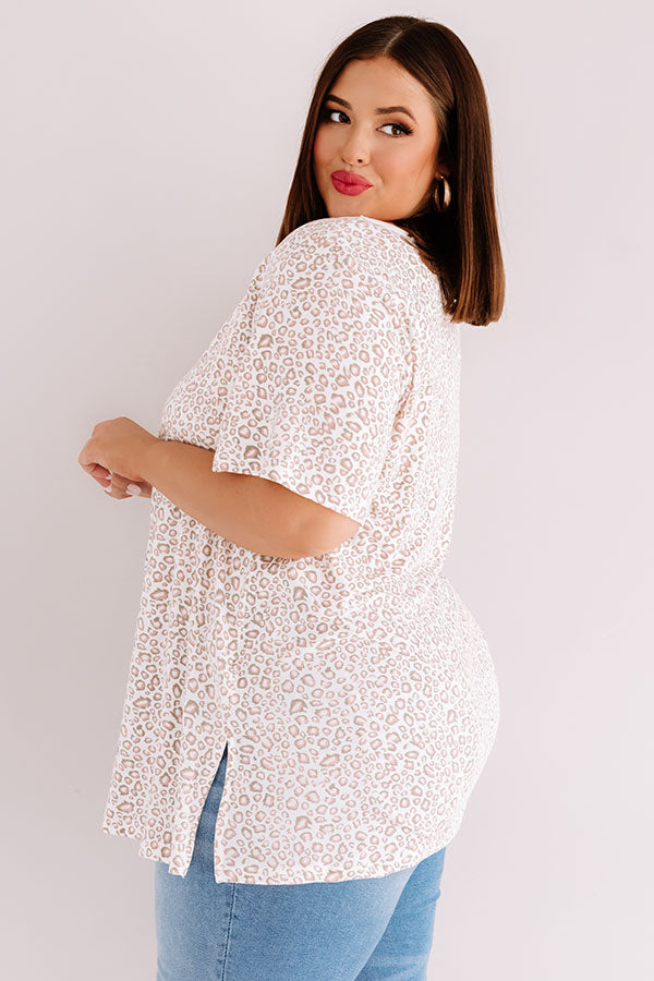 Plus Size - Travel in style with our stunning pink "Solo Trip" shift tee featuring soft lightweight material patterned with a subtle leopard print, a wide rounded neckline, short loose sleeves, and a relaxed silhouette that falls into a straight hemline with accent side slits! We have styled this casual cutie with some distressed ankle jeans and a white wedge and tote, but you can also wear it with some frayed white shorts, "The Mara Sandal in Pink," and our "Sunshine Suite Sunnies in Iced Latte!" Measurements