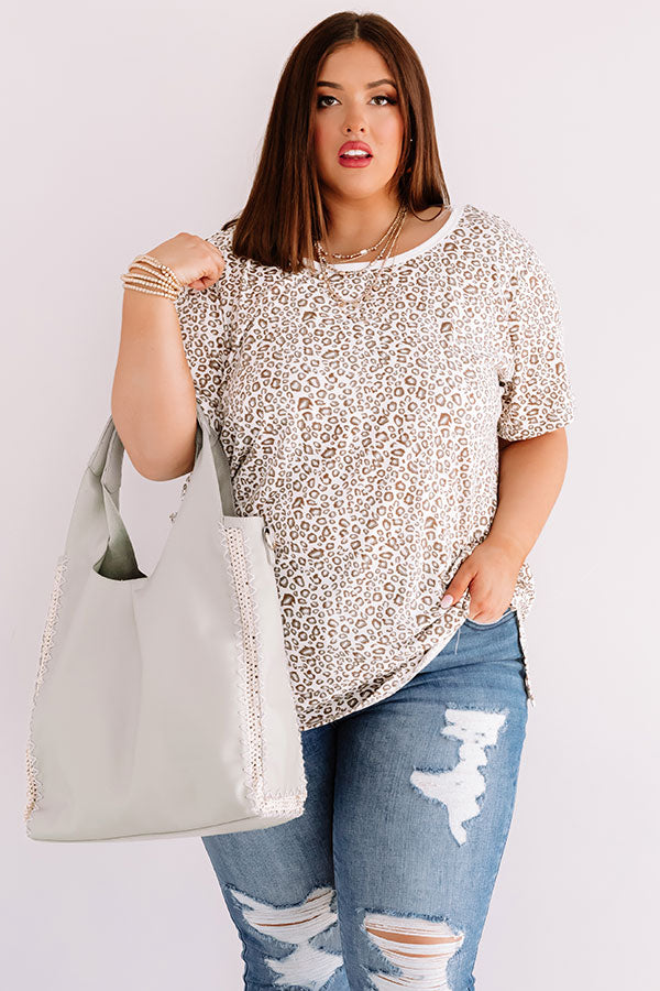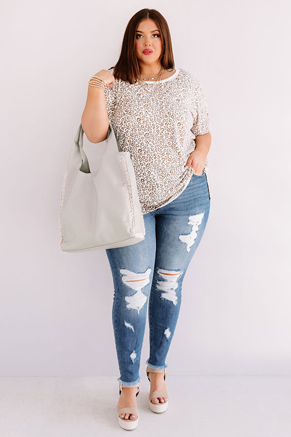 Plus Size - Travel in style with our stunning sage colored "Solo Trip" shift tee featuring soft lightweight material patterned with a subtle leopard print, a wide rounded neckline, short loose sleeves, and a relaxed silhouette that falls into a straight hemline with accent side slits! We have styled this casual cutie with some distressed ankle jeans and a neutral wedge and tote, but you can also wear it with some frayed white shorts, "The Lyla Sandal in Natural," and our "Sunshine Suite Sunnies in Iced Latte!" Measurements