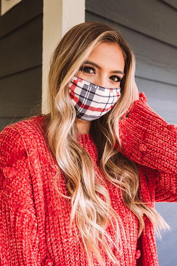 Our cream "Solo Trip" face mask features lightweight cloth material patterned with a black/navy and rust hued plaid print and two ear straps!