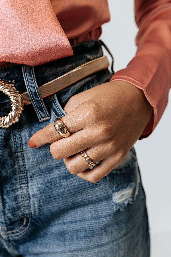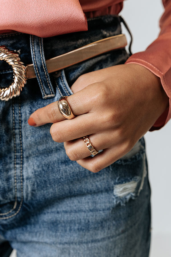 Add a bit of something more to your look with this cute ring set featuring three gold rings ranging from rounded solid bands and chain link band! This ring can fit between size 5-7 comfortably.