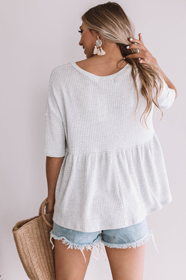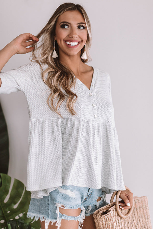This light grey top is "something special" with its waffle knit texture, elbow length sleeves, flowy bottom, and v-neck with a button up bodice! This classic piece has been styled with distressed shorts and a neutral wedge and straw tote for a cute warm weather outfit, but for a more transitional fall look, it can be paired with our black "Marleigh Mid Rise Ankle Skinny," "The Dawson Denim Jacket," and "The Kendal Bootie in Light Grey!" Measurements