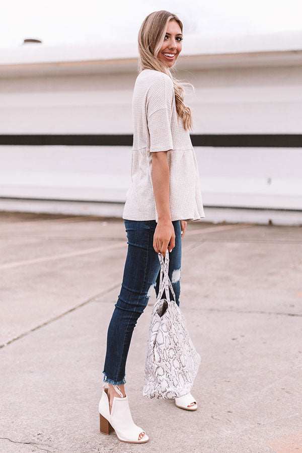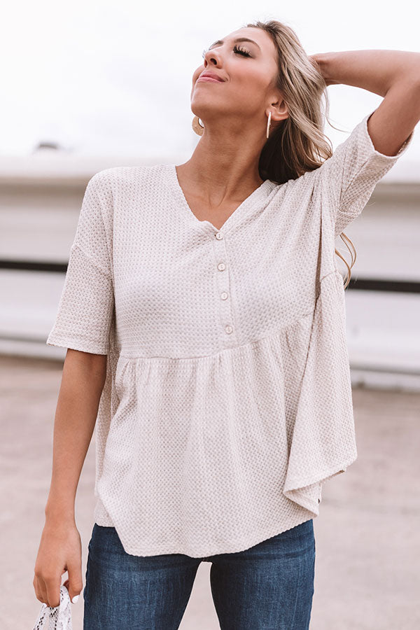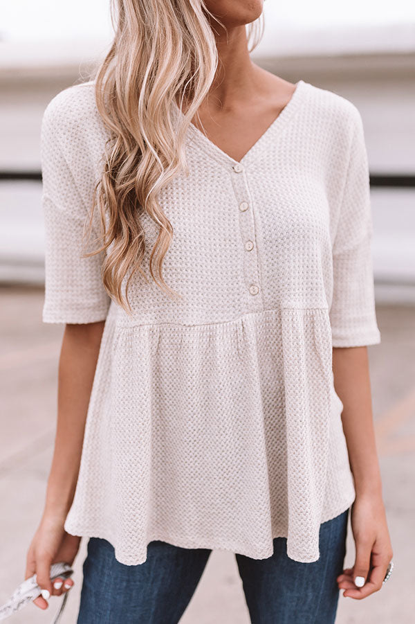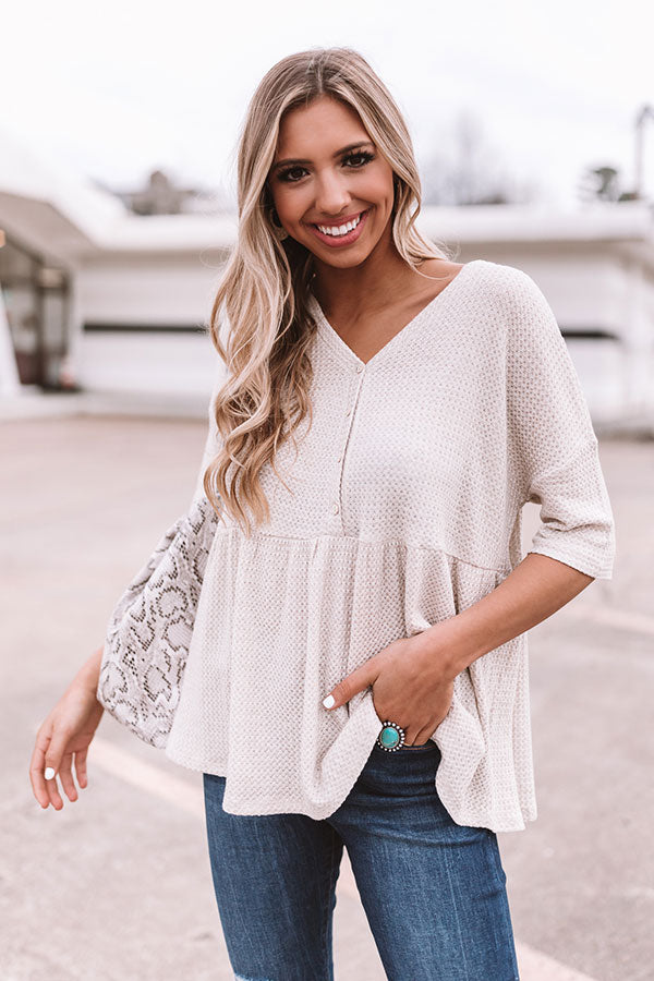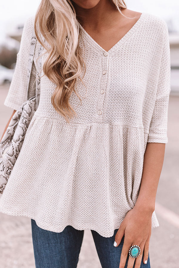 This warm taupe top is "something special" with its waffle knit texture, elbow length sleeves, flowy bottom, and v-neck with a button up bodice! This classic piece has been styled with distressed skinnies and a peep toe bootie and snake print tote. So all it needs now is a cute jacket for a simple transitional outfit and for a more warm warm weather look it can be paired with "The Camber Distressed High Waist Shorts" and "The Karter Faux Suede Sneaker in Birch!" Measurements