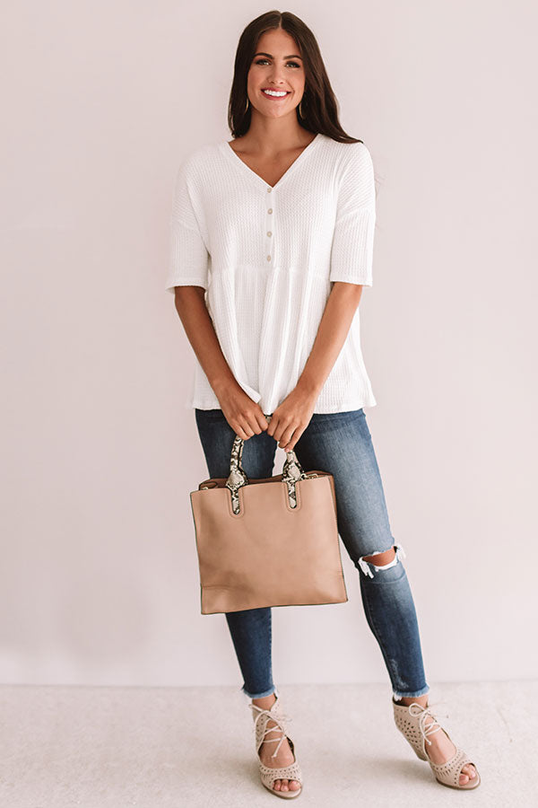 This adorable white top is surely "something special" with its lightweight material, subtle waffle knit texturing, elbow length fitted sleeves, a button up bodice with a v-cut neckline, and a relaxed silhouette that falls into an uneven hemline! This classic piece has been styled with distressed black skinnies and a neutral wedge and faux suede hat! So, now all it needs now is a cute jacket for a simple transitional outfit and for a more warm warm weather look it can be paired with "The Baker High Waist Shorts in Vineyard Grape" and "The Mara Sandal in White!" Measurements