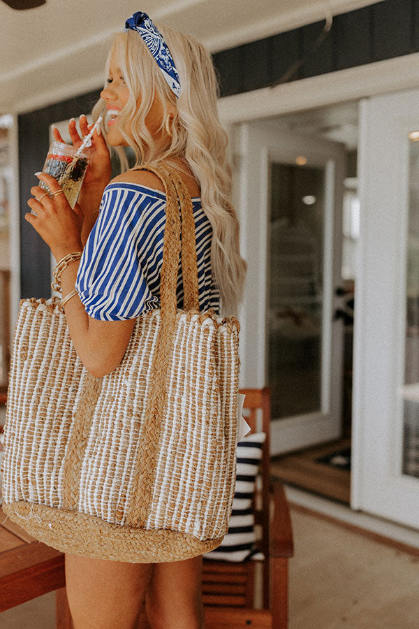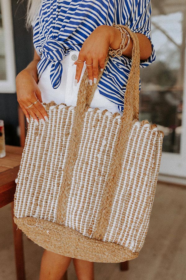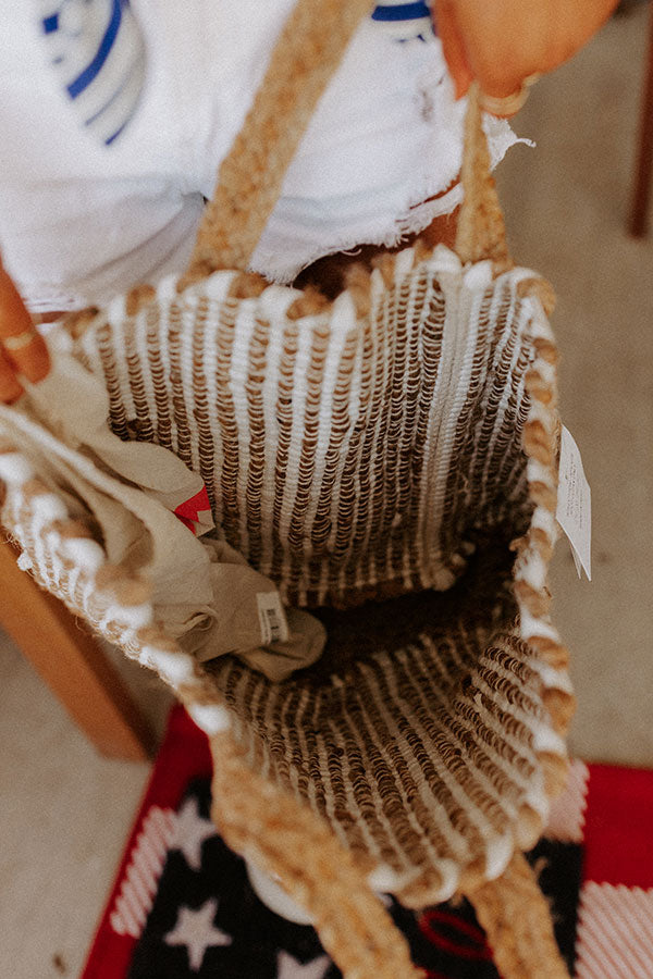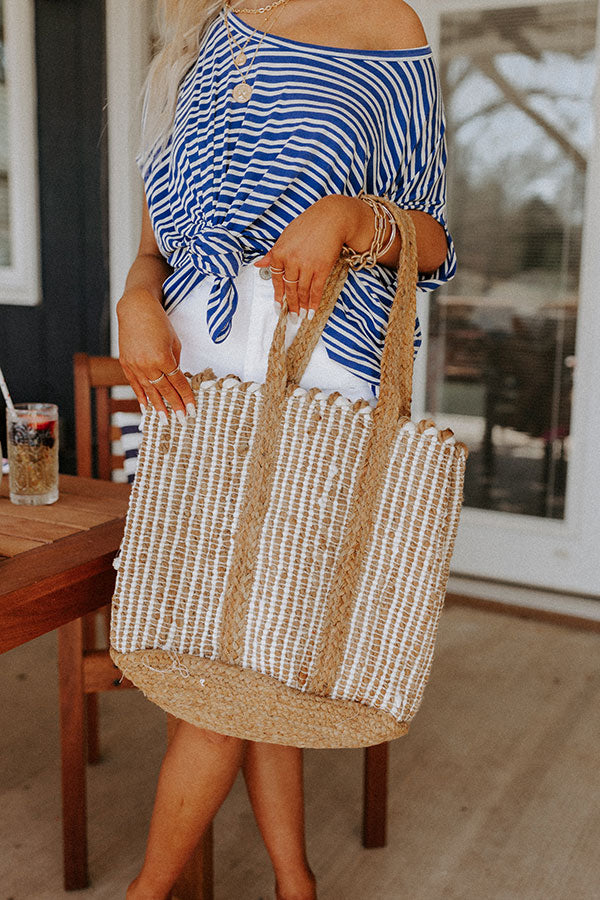 Perfect for carrying all your summer essentials, our adorabel 'Somewhere Sunny' tote features tan and white woven material, two tote handles, and a spacious interior!