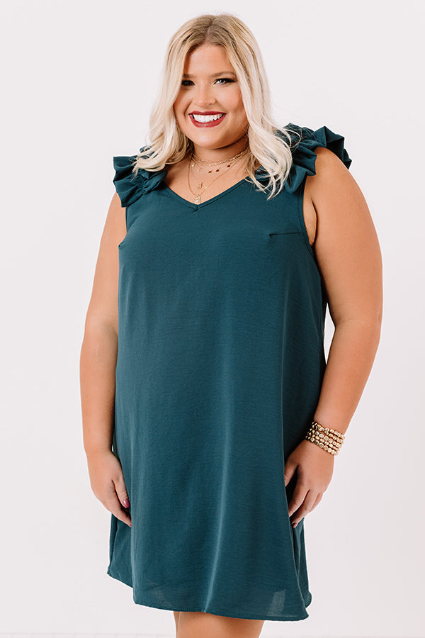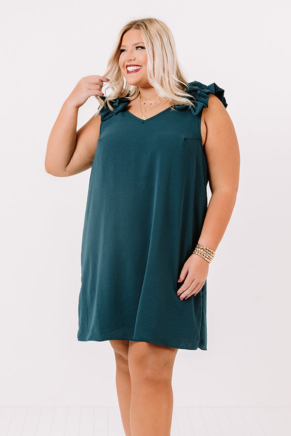Plus Size - Stay looking fabulous in our adorable teal colored "Song And Dance" shift dress featuring lightweight material, a v-cut neckline and upper back, oversized ruffled shoulder straps, and an ultra relaxed silhouette that falls into a straight mid-thigh length hemline! Measurements
