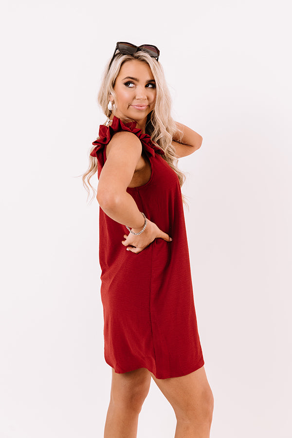 Stay looking fabulous in our adorable wine colored 'Song And Dance' shift dress featuring lightweight material, a v-cut neckline and upper back, oversized ruffled shoulder straps, and an ultra relaxed silhouette that falls into a straight mid-thigh length hemline! Measurements