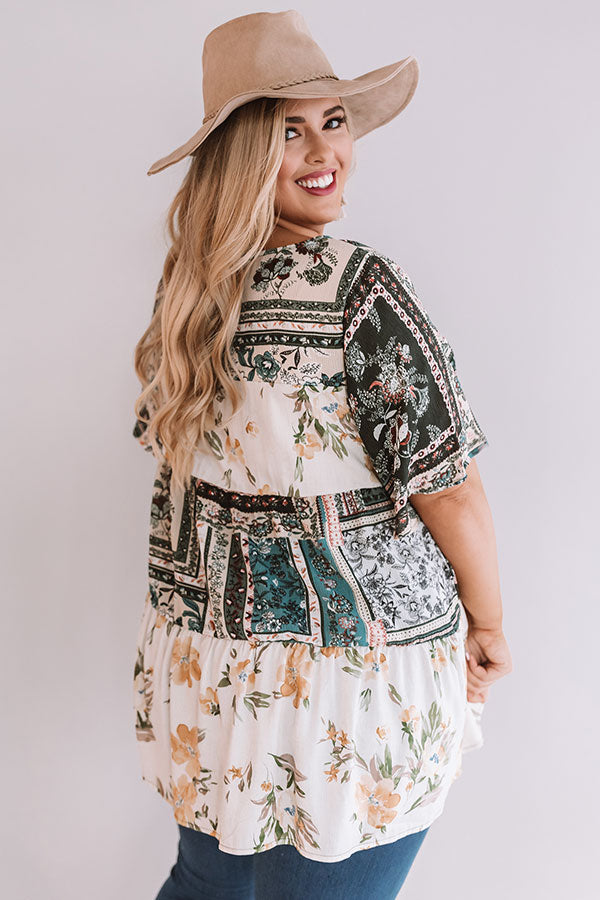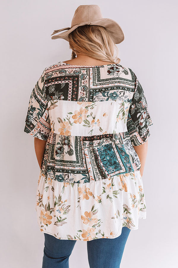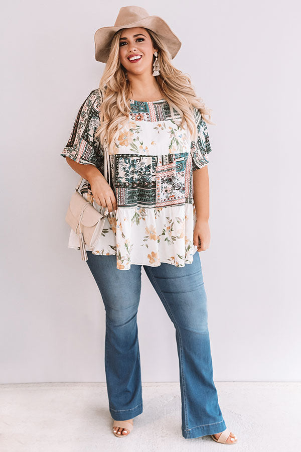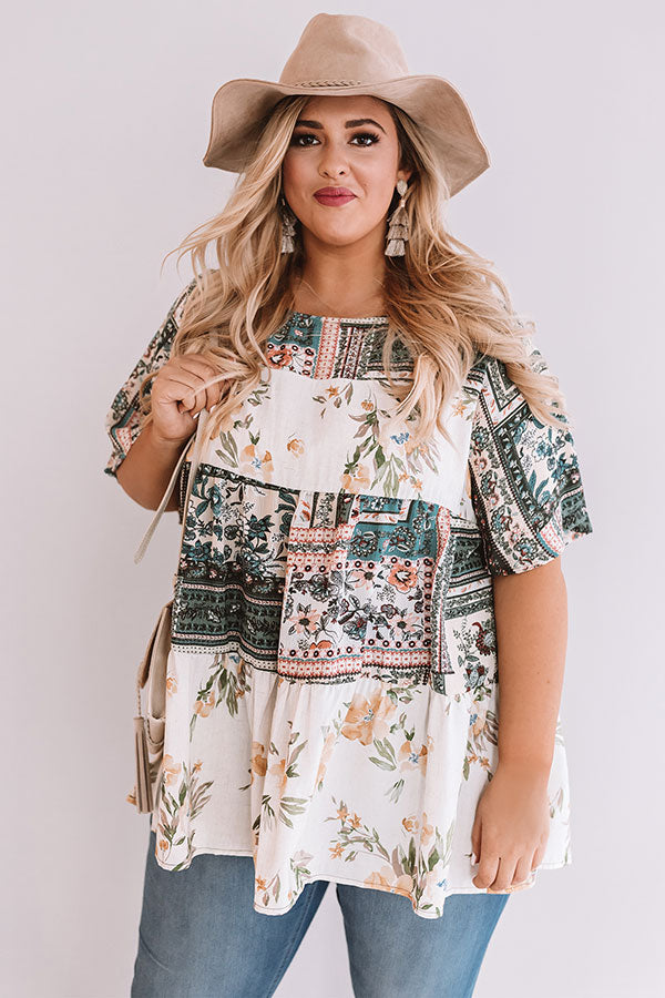 Plus Size - This teal mosaic top will have you standing out this summer with its light and dark panels and multiple floral patterns! It fits as comfy as a t-shirt but has the personality of a boho summer blouse! Pair it with some bell bottoms and wedges for a pretty and decorative outfit! Measurements