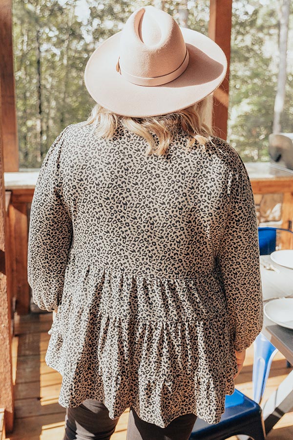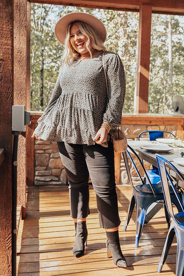Plus Size - We have no doubt you will stunningly chic in this gorgeous neutral hued top featuring soft lightweight material patterned with a small black leopard print, long bubble sleeves with fitted elastic cuffs, a high rounded neckline, and a relaxed tiered babydoll silhouette that falls into an uneven hemline! Measurements
