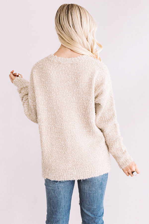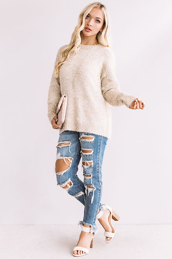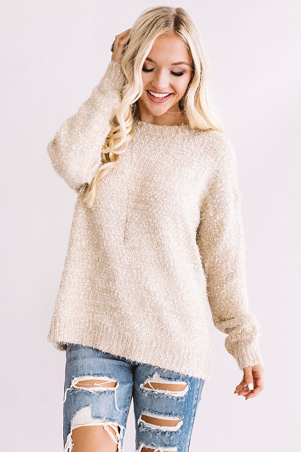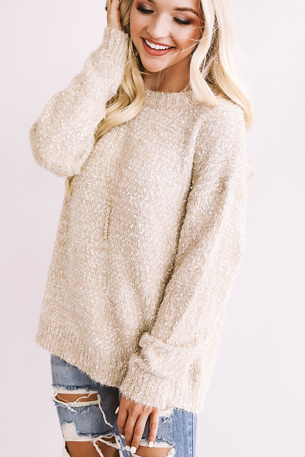 Let your inner light shine when you wear this ritzy and glitzy sweater featuring lightweight loose knit fuzzy material, a high rounded neckline, long loose sleeves with fitted cuffs, and a relaxed silhouette that falls into a straight hemline! This eye catching cold weather piece styles perfectly with some distressed ankle skinnies and a neutral clutch and heel, or with our "Sweet Victory High Waist Corduroy Skirt in Wine," our "Leopard Forever Headband," and "The Emmaline Leopard Bootie" for a variety of looks that are sure to have everyone FALLing in love with you! Measurements