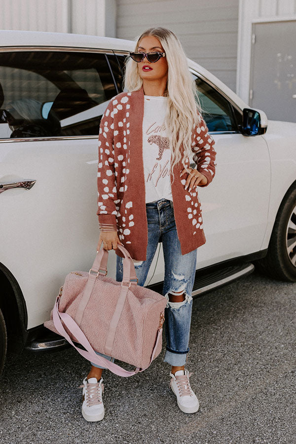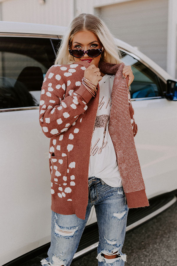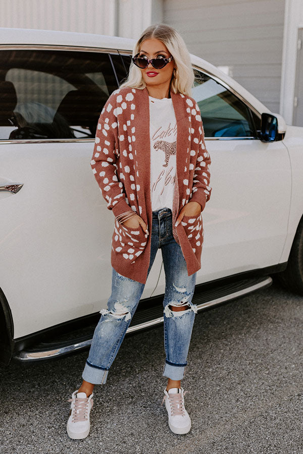 While sightseeing in Sonoma, stay looking stylish with this rustic rose colored cardigan featuring soft tight knit material with a white spotted leopard pattern, long loose sleeves with fitted rolled cuffs, wide trim, and a relaxed open front silhouette that falls into a straight mid-thigh length hemline! You can style this versatile piece with just about anything from a basic tank to a sweater, jeans to dresses, wedges to sandals, clutches to totes, and hats to earrings!