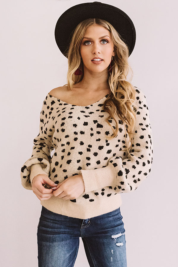 When sightseeing in Sonoma, stay looking stylish with this iced latte colored sweater featuring oft tight knit material with a black leopard pattern, a wide v-cut neckline that can be worn off one shoulder, long loose sleeves with fitted forearm cuffs, and an ultra relaxed silhouette that falls into a wide straight ribbed hemline! We have styled this cold weather cutie with some distressed skinnies, a wine clutch, and a black bootie and faux suede hat, but you can also wear it with some black flares and "The Lyra Heel in Iced Latte!" Measurements