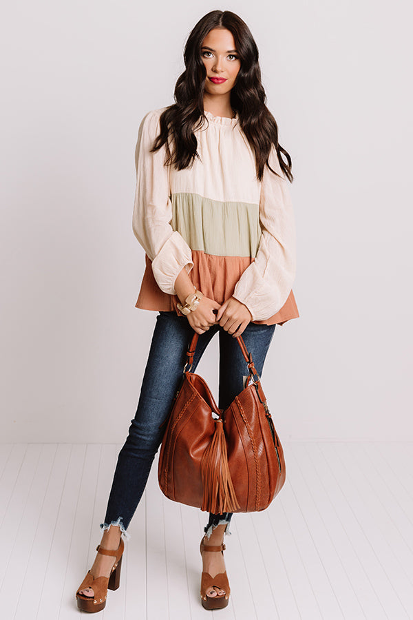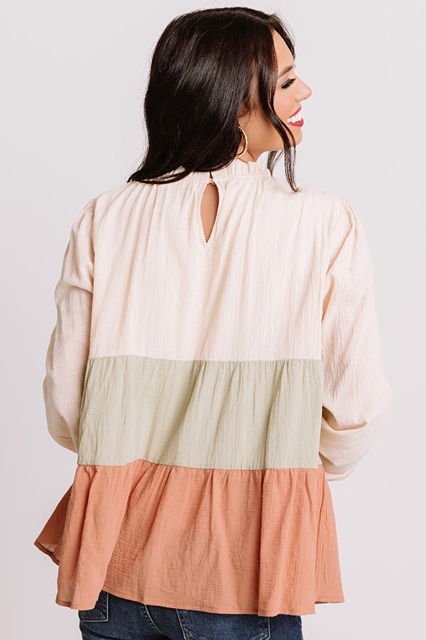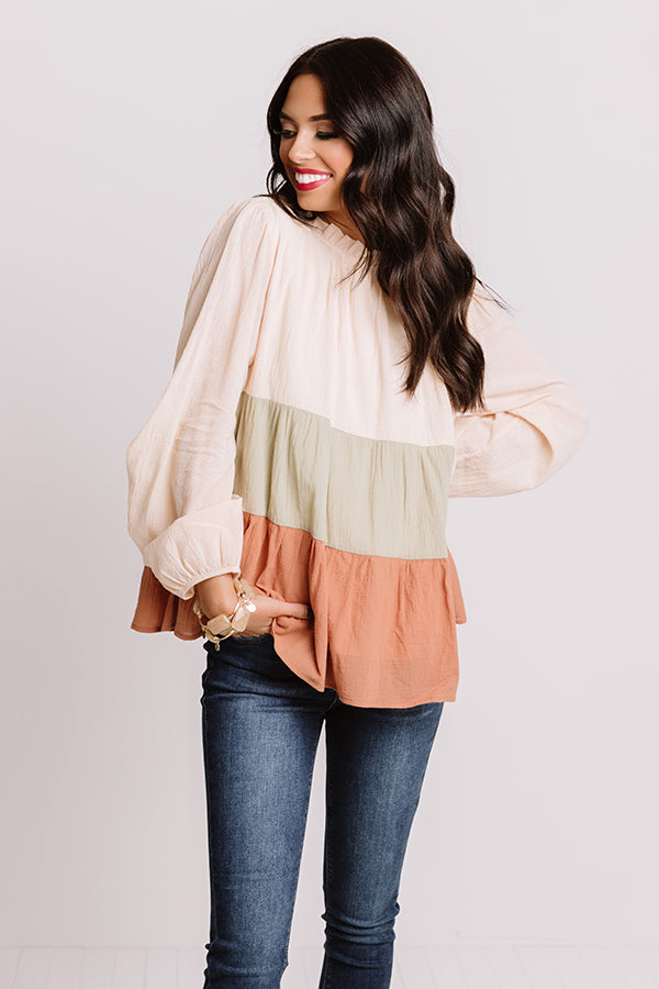 Create your own sunshine in this charming shift top featuring lightweight flowy material with wide horizontal cream, pear, and burnt orange colored color block panels, a high rounded neckline, long bubble sleeve with fitted elastic band cuffs, a keyhole accented upper back with a button closure, and a relaxed tiered silhouette that falls into an uneven hemline!
